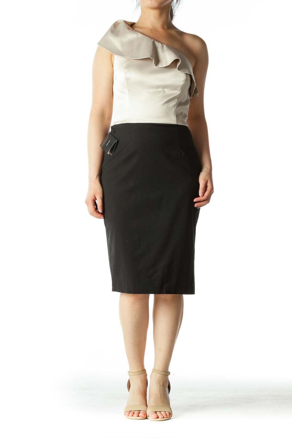 Beige Black One-Shoulder Ruffled Detail Cocktail Dress