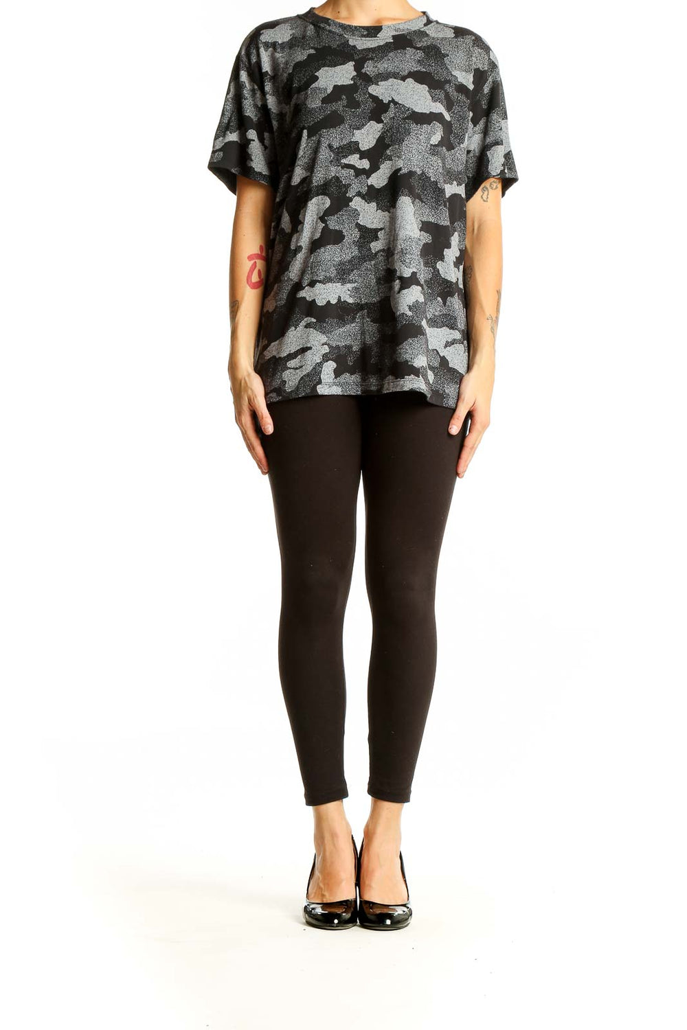 Elevate your workout wardrobe with this stylish gray camouflage print activewear top from SilkRoll. Perfect for your fitness routine or casual athleisure wear, this versatile piece combines comfort and trendy design. The polyester fabric ensures durability and easy care, while the medium size offers a relaxed fit for unrestricted movement during any activity. With its unique camo pattern in shades of gray and black, this top adds an edgy touch to your athletic ensemble. The short sleeves and crew neckline provide classic styling, making it suitable for various workout settings or running errands. In good condition, this SilkRoll top is ready to become your go-to piece for both gym sessions and laid-back weekends.