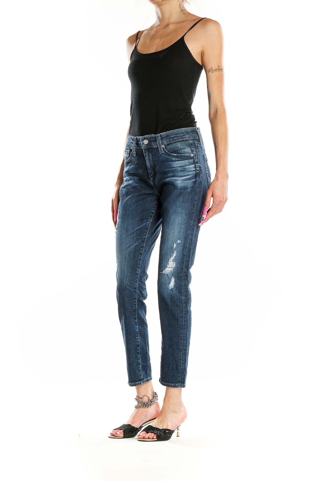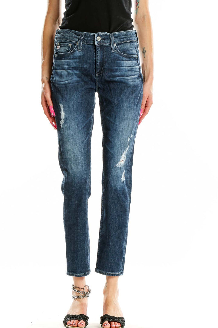 Elevate your denim game with these stylish blue distressed slim fit jeans from AG. Crafted from a comfortable blend of cotton, lyocell, and polyurethane, these jeans offer both durability and stretch for all-day wear. The medium wash blue denim features subtle distressing, adding a touch of edgy charm to your outfit.