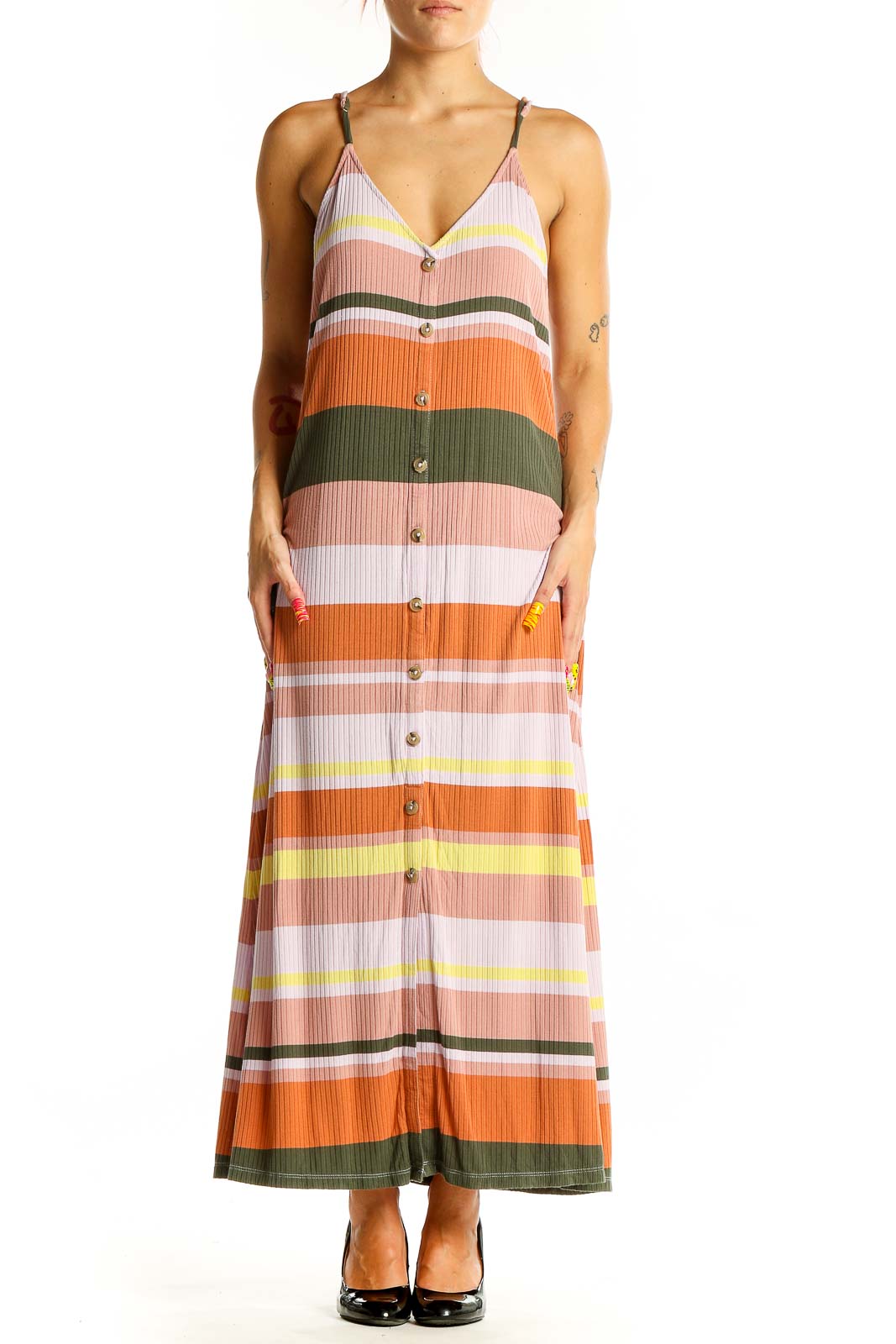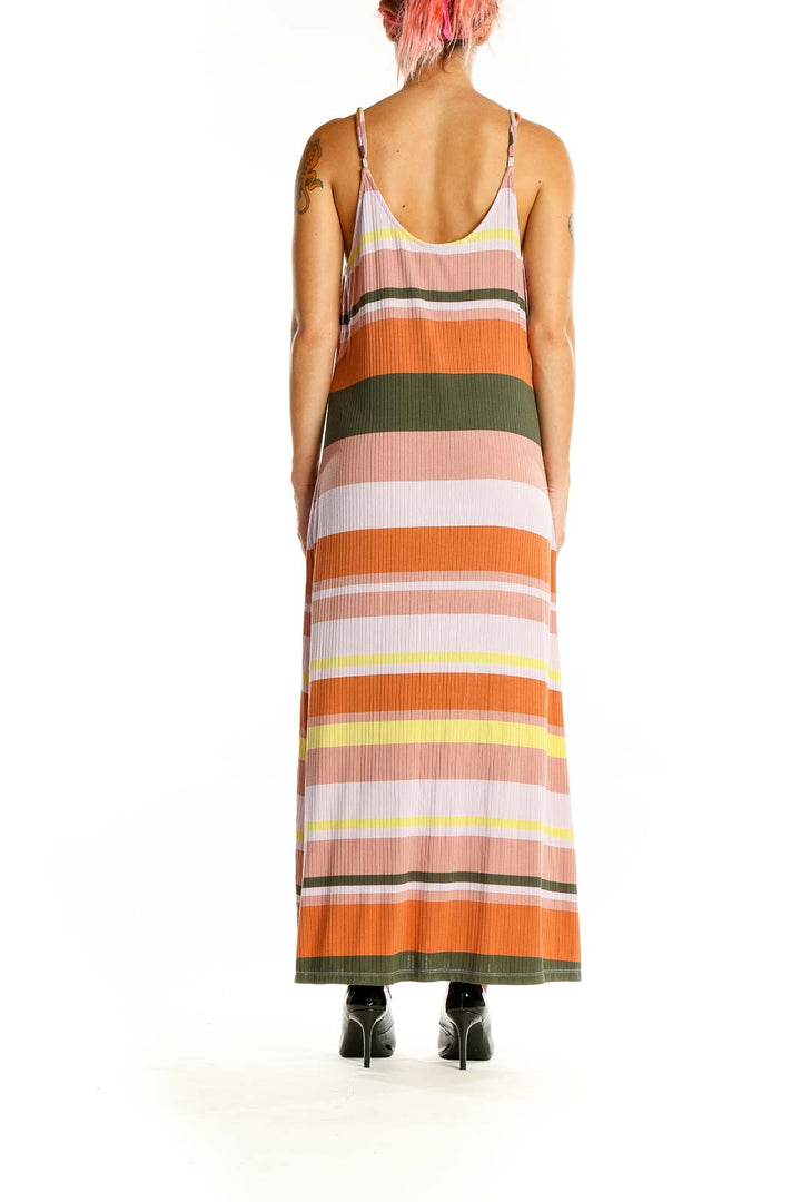 The eye-catching striped pattern combines shades of pink, orange, yellow, green, and white, creating a cheerful and summery palette. This excellent condition dress is a size Large and measures 36" in the bust and hips, with a 32" waist and 49" length, making it suitable for a variety of body types.
