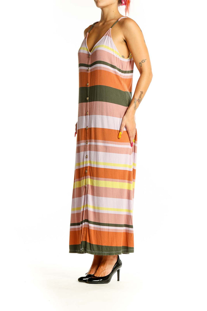 Make a statement with this vibrant multicolor striped maxi dress from LOFT. Perfect for summer days or beach getaways, this dress features a flattering V-neckline and thin adjustable straps for a comfortable fit. The button-down front adds a touch of versatility, allowing you to customize your look.