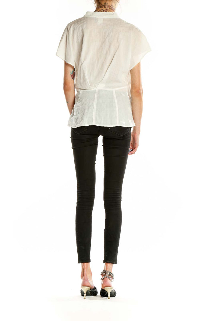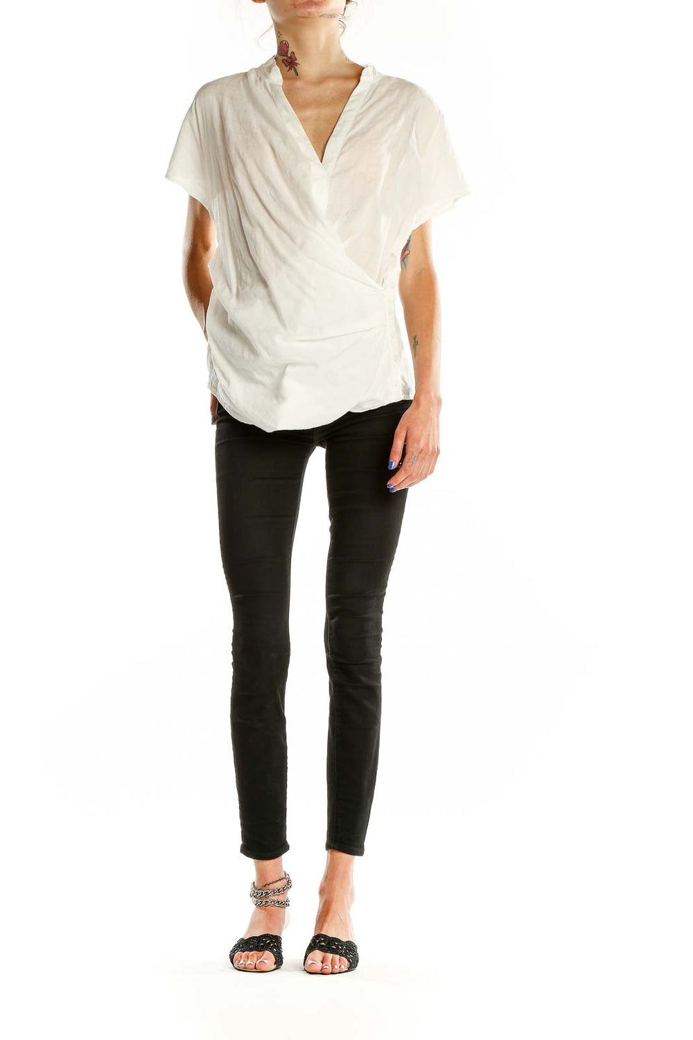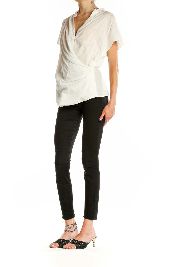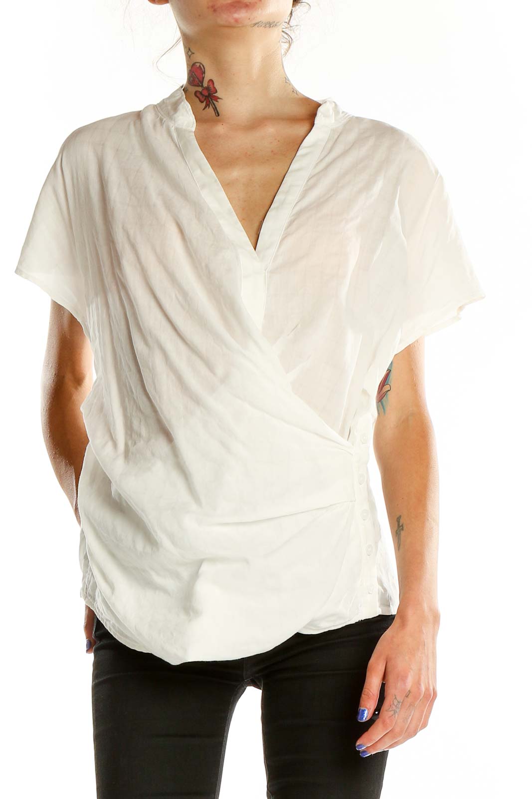 Elevate your wardrobe with this elegant white wrap-style blouse from Akemi + Kin. Crafted with a flattering V-neckline and short sleeves, this versatile top exudes effortless sophistication. The wrap design creates a feminine silhouette, accentuating your curves while providing comfort and ease of movement. Made from a lightweight, breathable fabric, it's perfect for both casual outings and dressier occasions. The excellent condition of this size Large blouse ensures you'll look polished and put-together every time you wear it. With its generous measurements (Bust 36", Length 27", Waist 30"), it offers a comfortable fit for various body types. Pair this Akemi + Kin blouse with your favorite jeans for a chic everyday look, or dress it up with a skirt for a more formal ensemble.