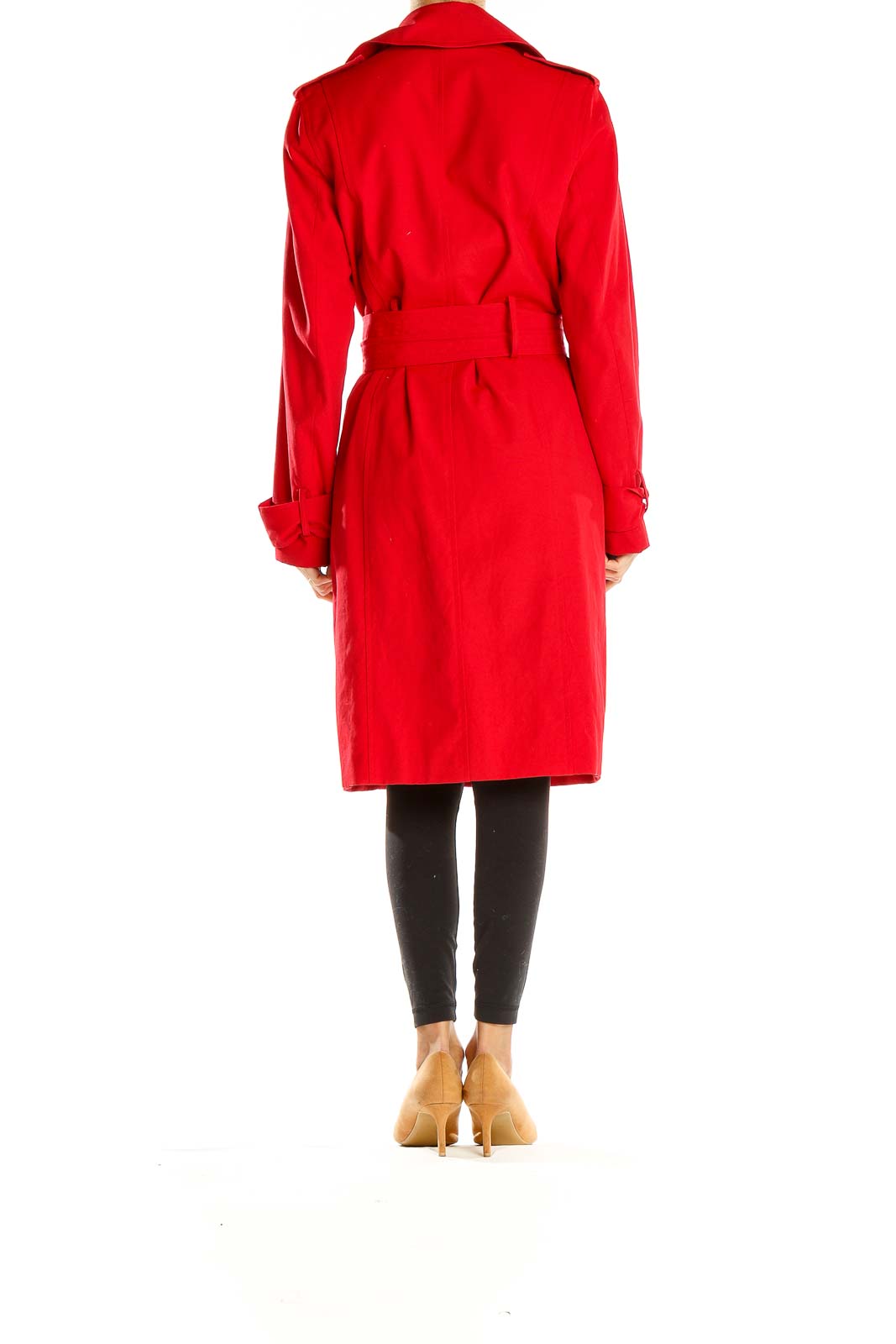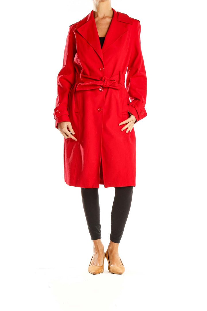 Make a bold statement with this stunning red trench coat from Alfani. This classic silhouette features a flattering belted waist, accentuating your figure while providing warmth and style. The coat's long length offers excellent coverage, perfect for cooler days or evening outings. Crafted with attention to detail, it boasts a notched collar, button-front closure, and adjustable cuff straps for a polished look. The vibrant red hue adds a pop of color to any outfit, making it a versatile piece for your wardrobe. In excellent condition, this size small coat is a timeless addition that combines fashion and function seamlessly.