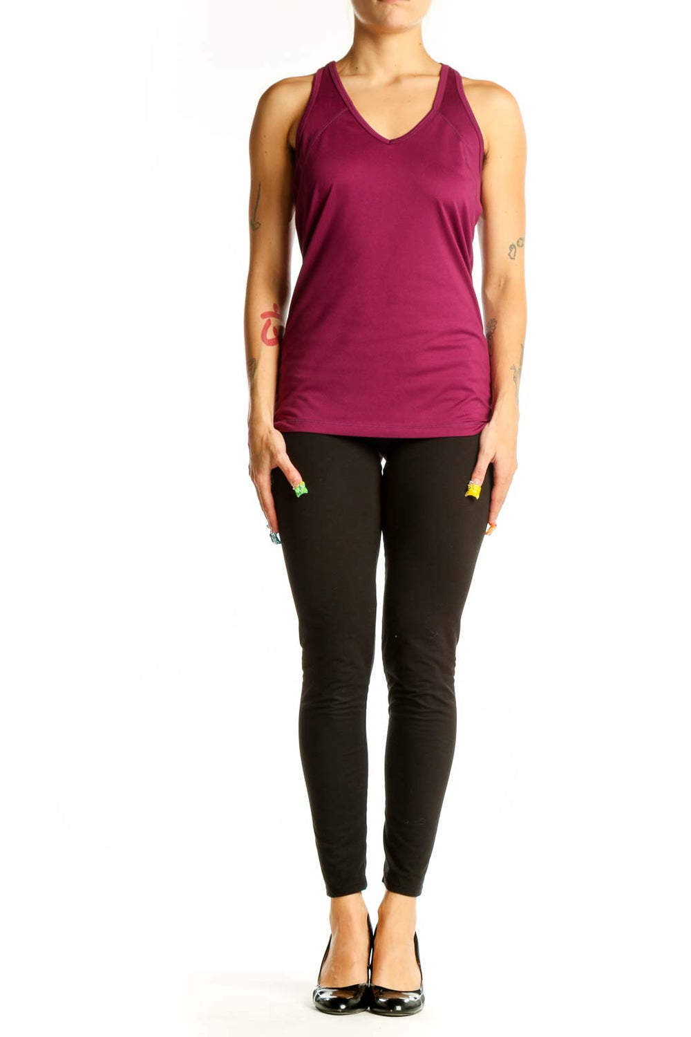 Elevate your workout wardrobe with this sleek burgundy athletic tank top from Alo. Crafted from a high-performance blend of polyester and spandex, this top offers both comfort and flexibility for your most intense training sessions. The V-neck design adds a touch of style, while the racerback cut ensures unrestricted movement and enhanced breathability.