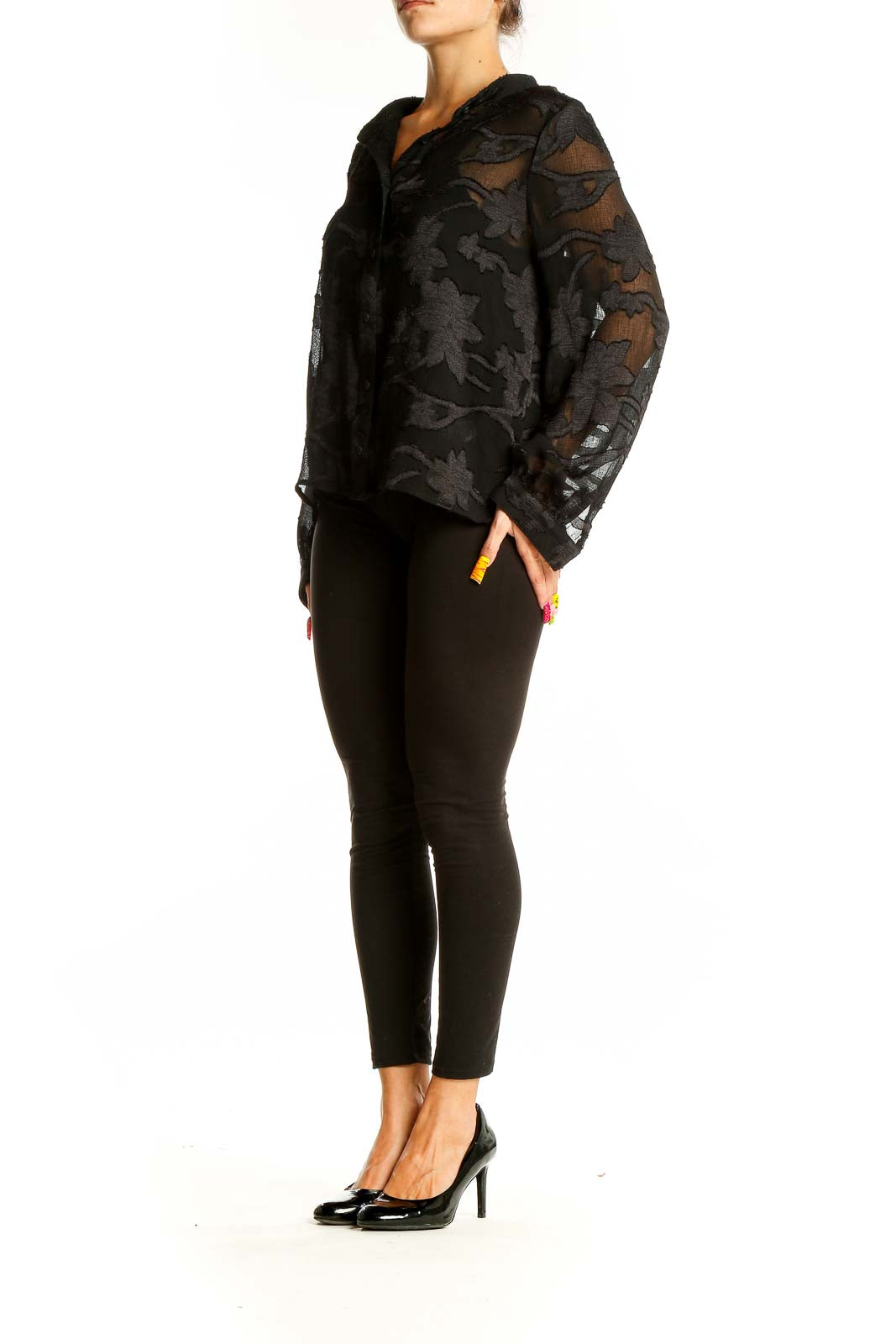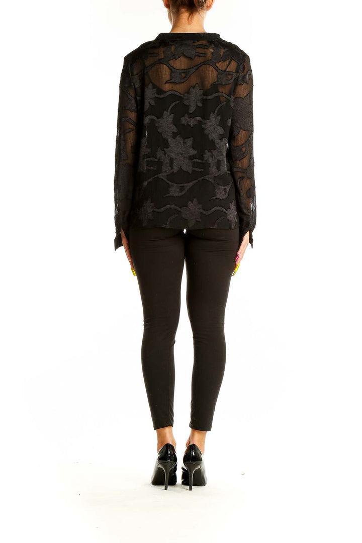 Elevate your wardrobe with this stunning black sheer blouse by Amadi. Featuring an alluring floral burnout pattern, this top combines elegance with a touch of mystery. The button-up front and long sleeves offer versatility, allowing for both professional and casual styling. Crafted from a luxurious blend of rayon, polyester, elastane, and spandex, this blouse drapes beautifully and offers comfortable stretch. The semi-sheer fabric adds a layer of sophistication, perfect for layering or wearing as a statement piece. In excellent condition, this medium-sized top boasts generous measurements to ensure a flattering fit for various body types. Whether paired with sleek trousers for the office or your favorite jeans for a night out, this Amadi blouse is sure to become a go-to piece in your collection.