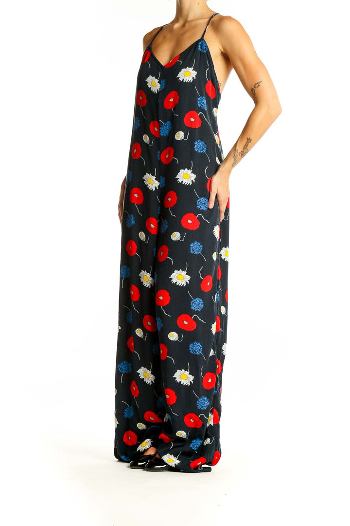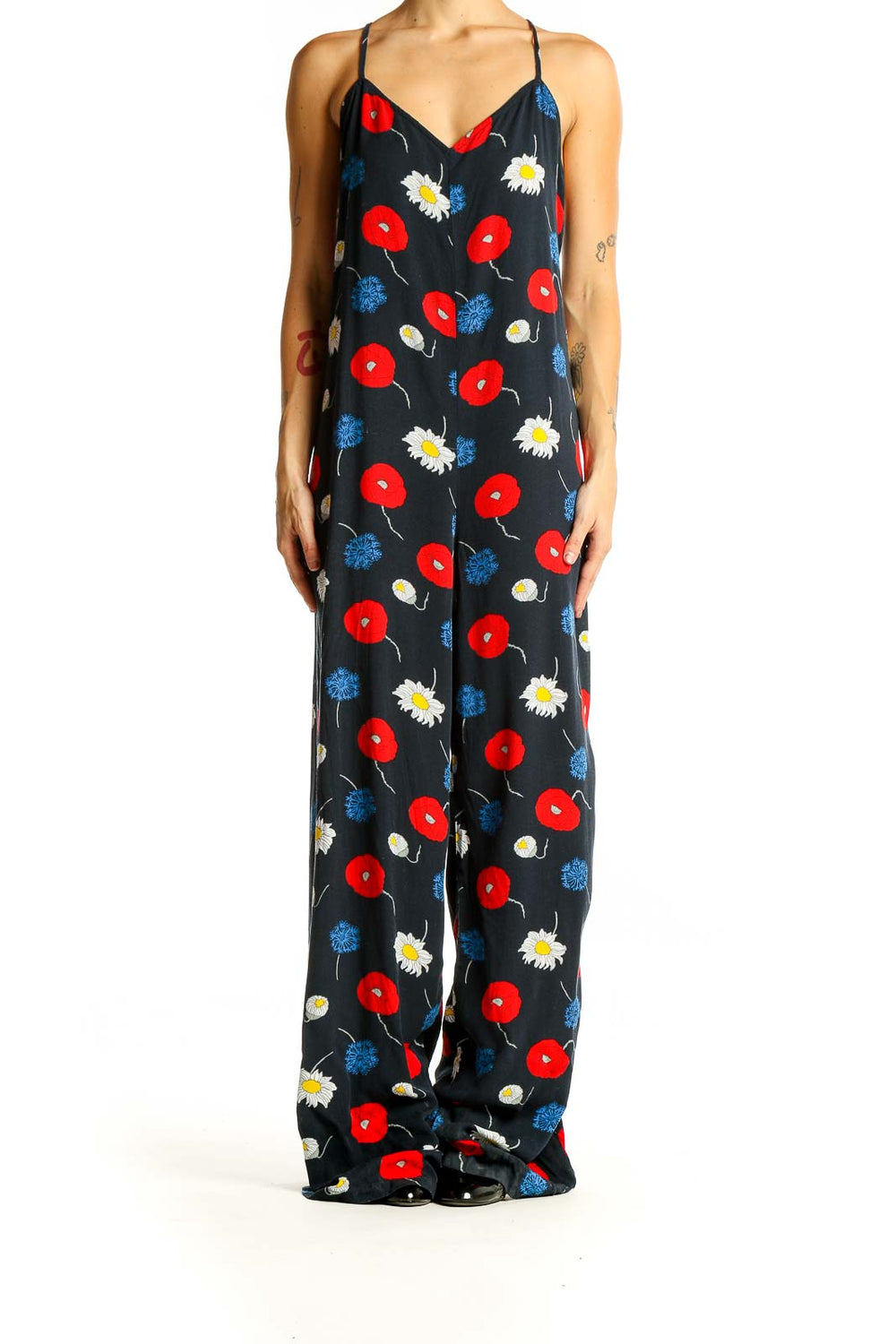 Make a statement with this eye-catching Black Floral Print Jumpsuit from American Apparel. This all-in-one piece features a striking pattern of vibrant red poppies, cheerful daisies, and blue cornflowers scattered across a deep black background, creating a bold and feminine look.