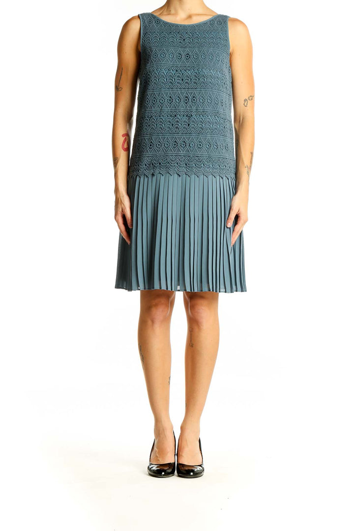 Elevate your evening attire with this stunning teal cocktail dress from Ann Taylor LOFT Petites. The intricate lace bodice showcases a beautiful geometric pattern, adding a touch of elegance and sophistication. The sleeveless design and boat neckline create a flattering silhouette, perfect for various formal occasions.