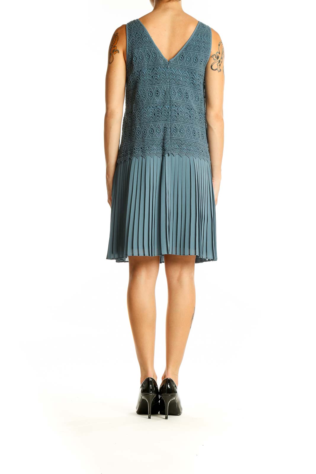 The dress transitions seamlessly into a pleated skirt, offering a graceful and flowing movement as you walk. Made from a blend of cotton and polyester, this dress combines comfort with style. The excellent condition ensures you'll look impeccable throughout your event.