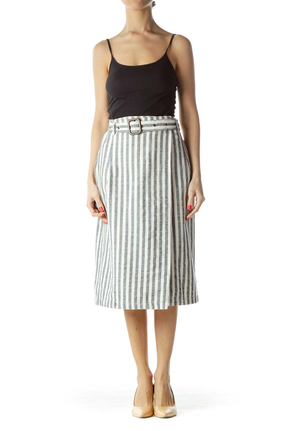 Navy Blue Cream Striped Belted Wrap Pencil Skirt