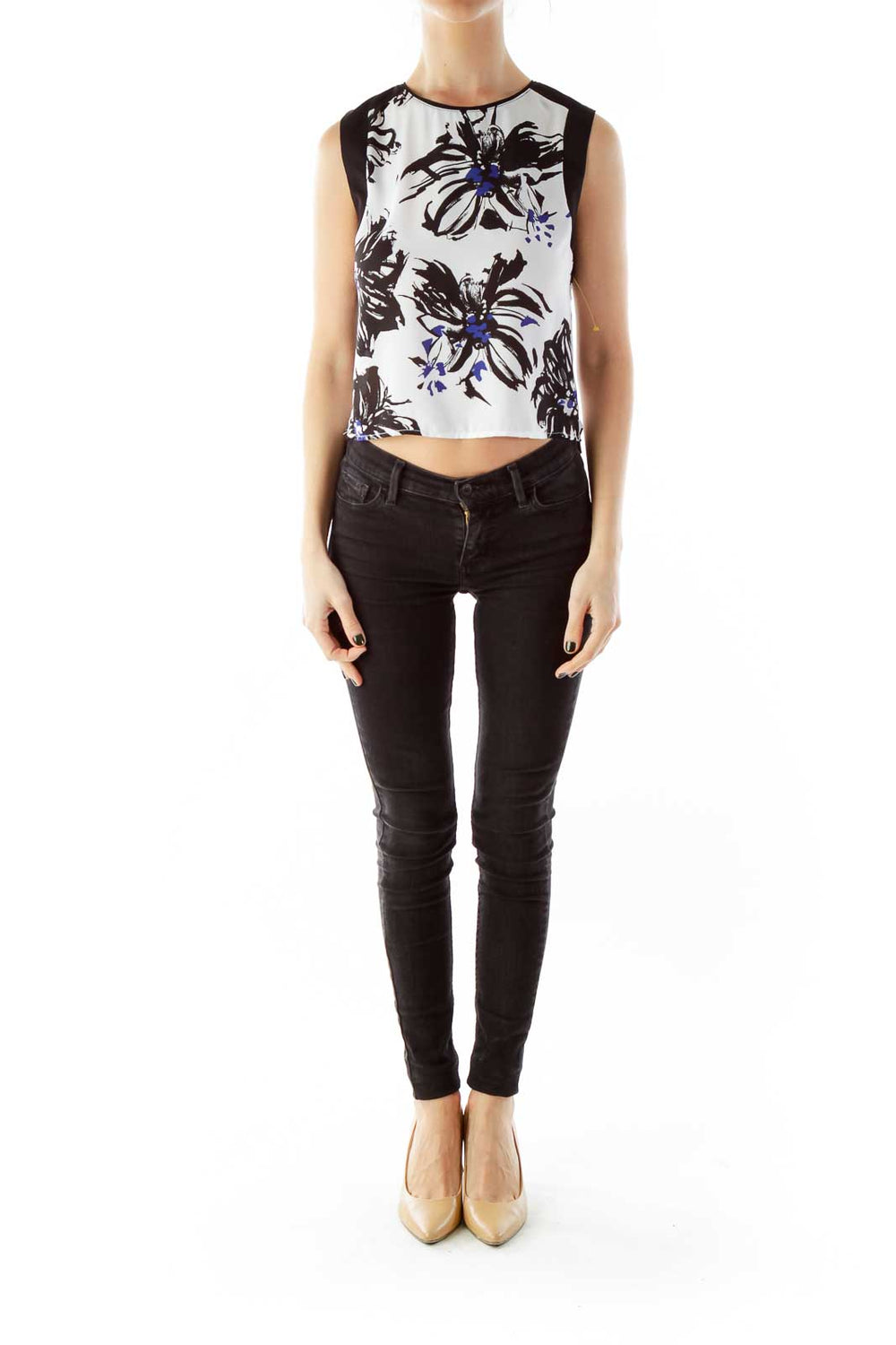 Black White Blue Flower Print Cropped Tank Top