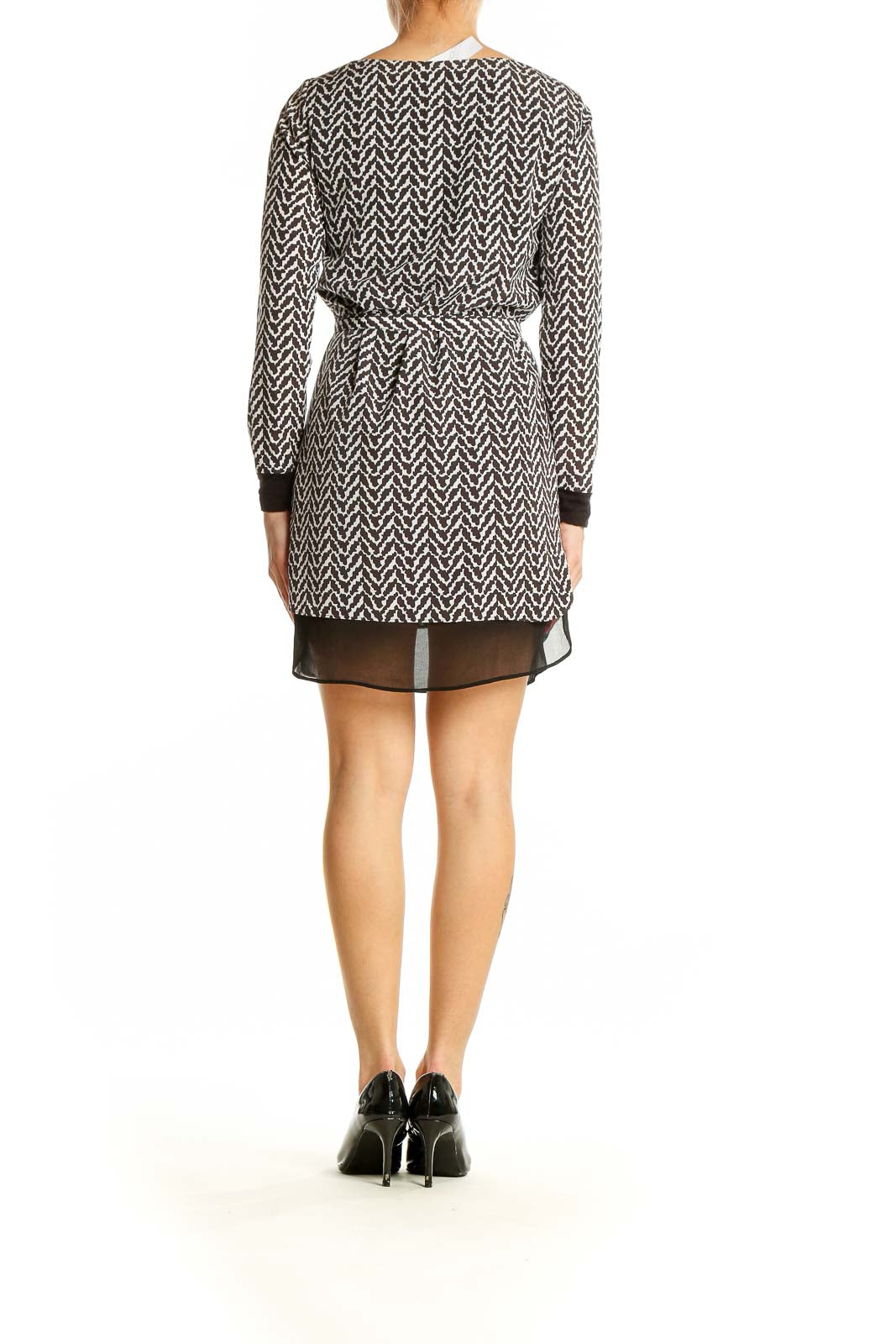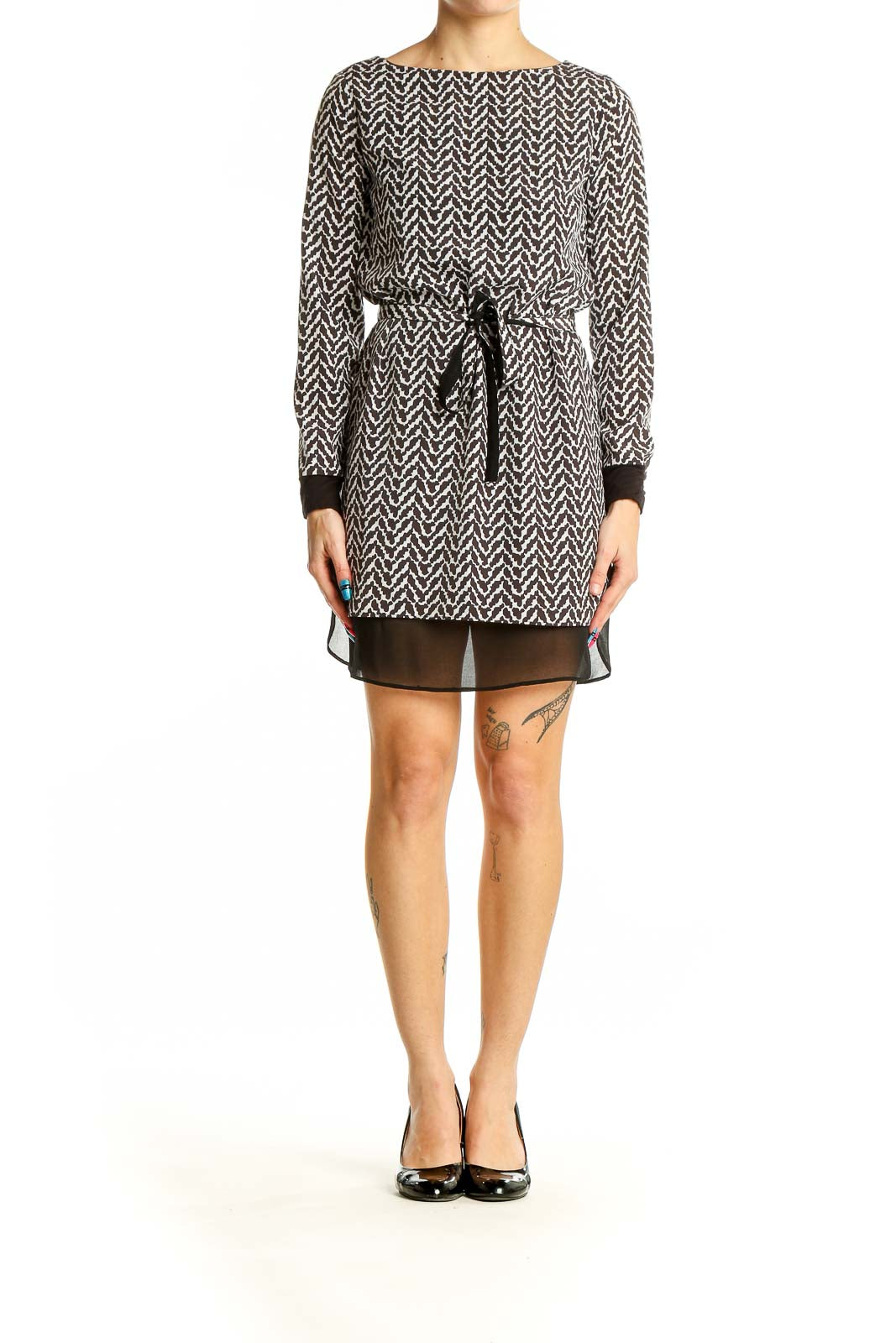 The dress showcases a sophisticated boat neckline and long sleeves, ideal for transitional weather. A sleek tie belt at the waist accentuates your figure, while the short length adds a touch of allure. The sheer black panel at the hem provides a subtle contrast, elevating the overall design.
