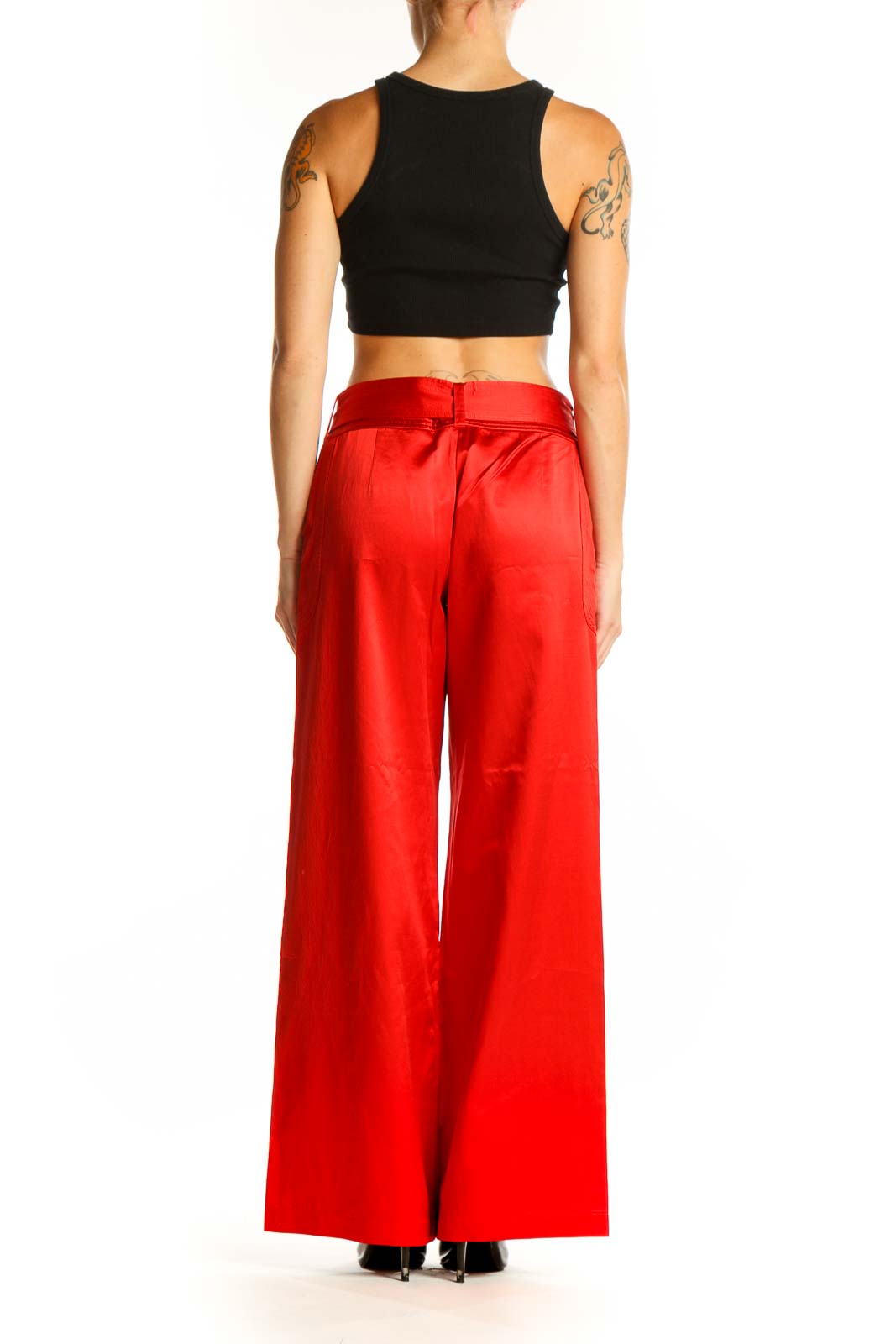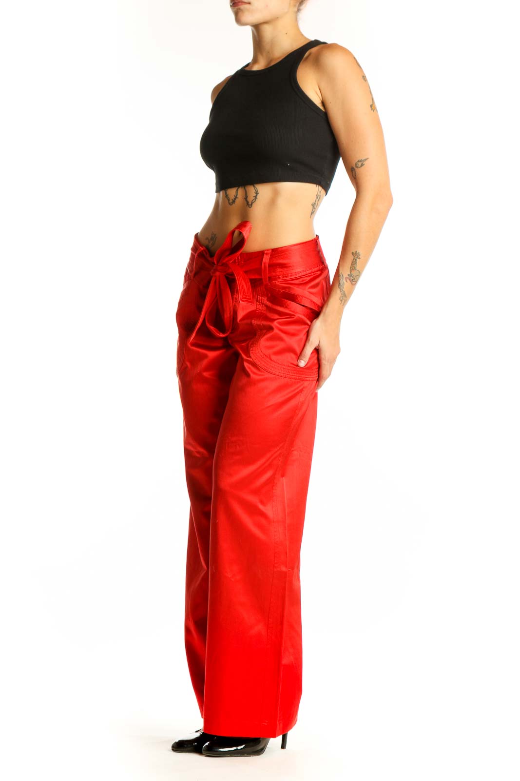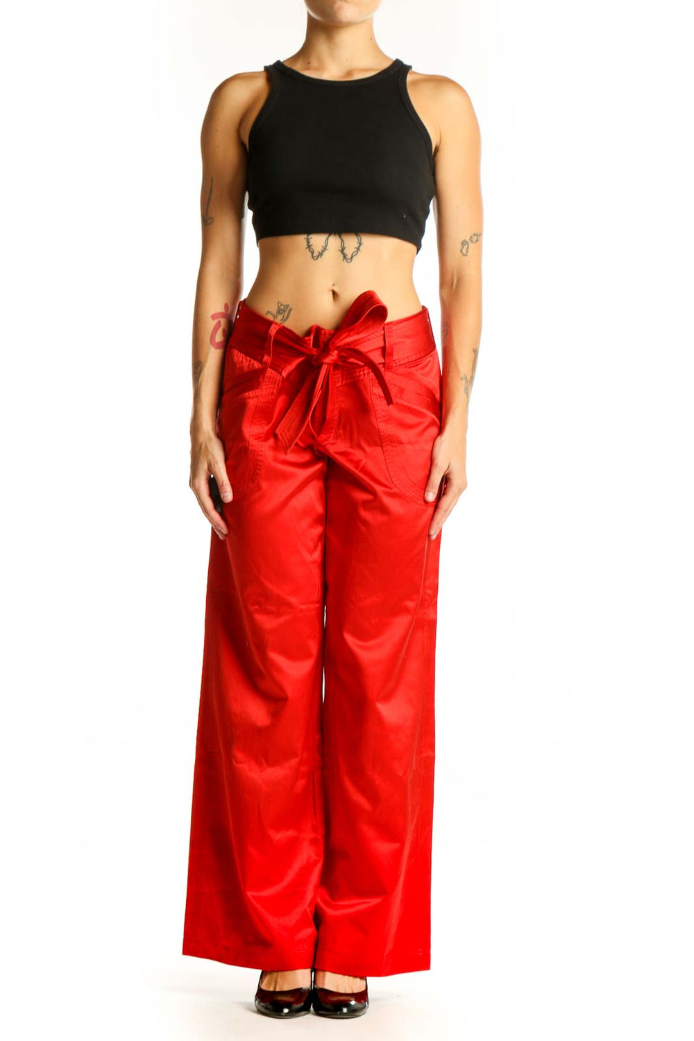 Make a bold statement with these eye-catching red satin wide-leg pants from Armani Exchange. The luxurious blend of cotton and silk creates a smooth, lustrous finish that catches the light beautifully. The standout feature is the elegant bow-tie detail at the waist, adding a touch of feminine charm to the sleek silhouette.