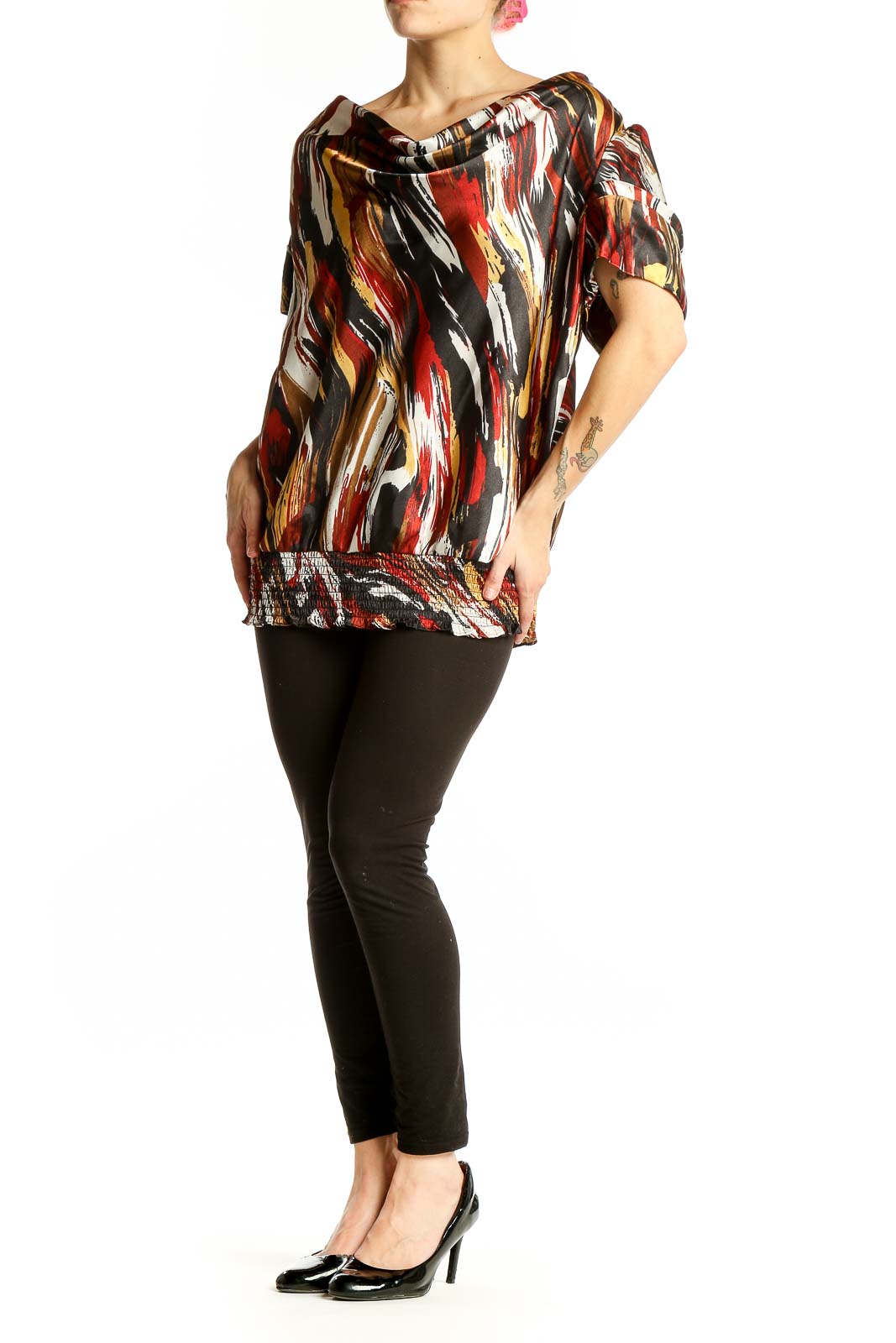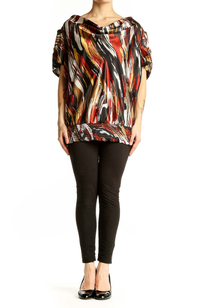Make a bold statement with this eye-catching Multicolor Abstract Print Cowl Neck Top from Ashley Stewart. This vibrant plus-size top features a striking abstract pattern in shades of red, brown, black, and white, creating a dynamic and artistic look. The flowing polyester fabric drapes beautifully, accentuated by the elegant cowl neckline that adds a touch of sophistication.