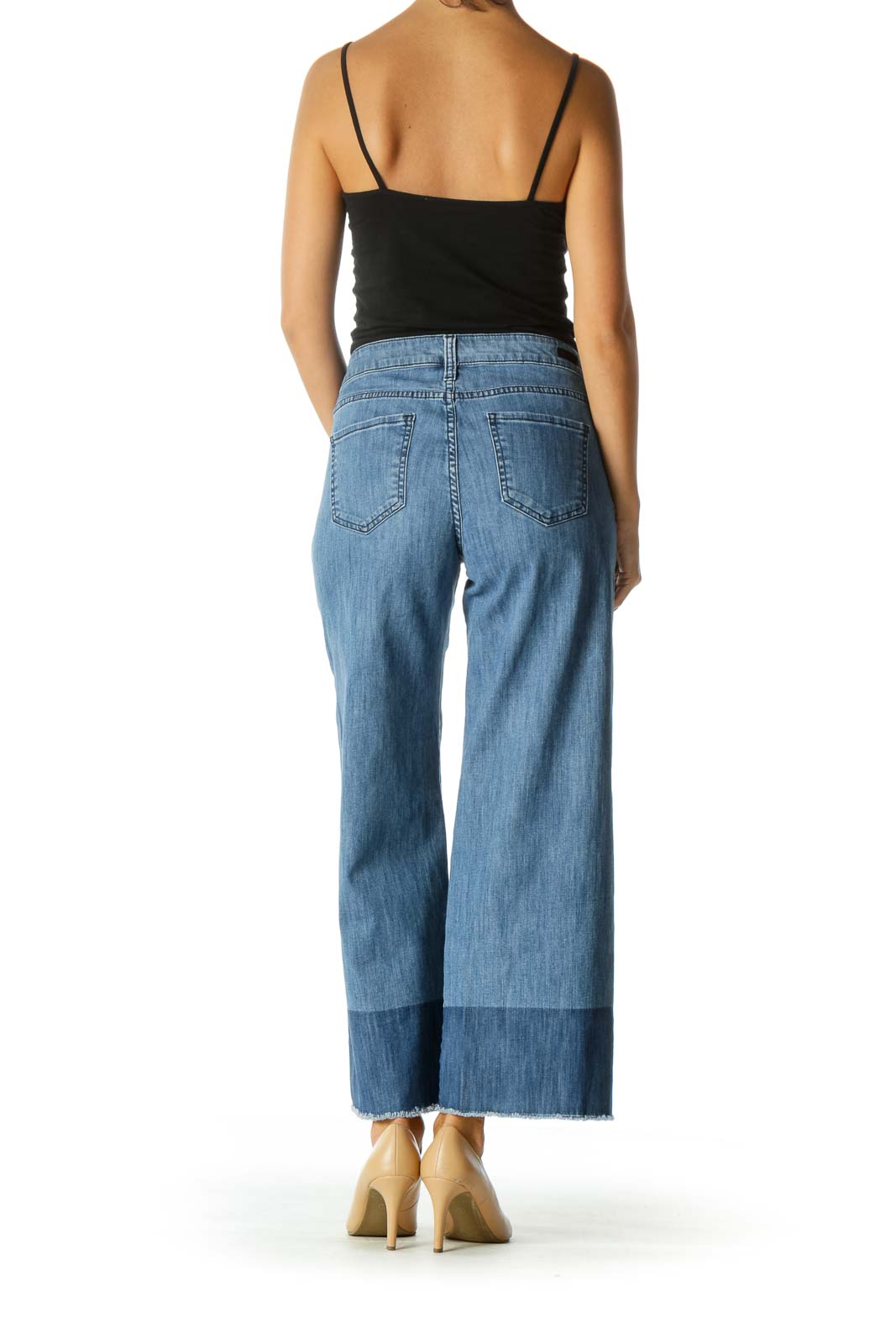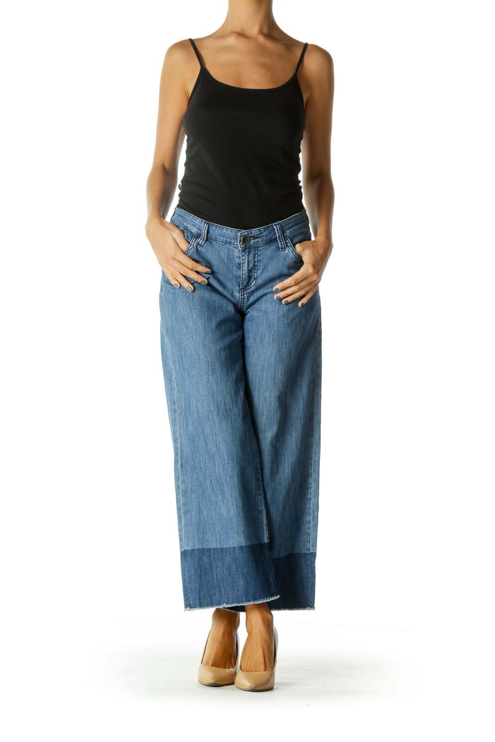 Blue Raw Hem Color Block Wide Leg Stretch Cropped Denim Pants