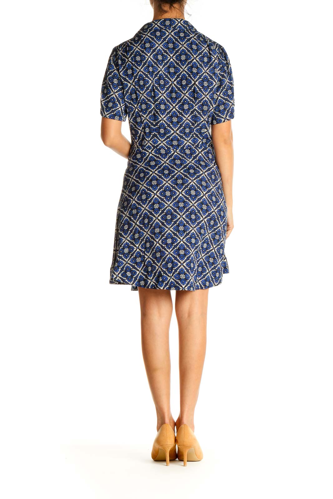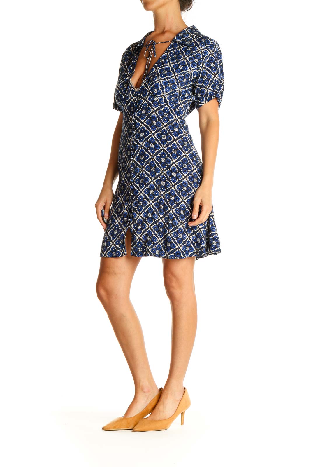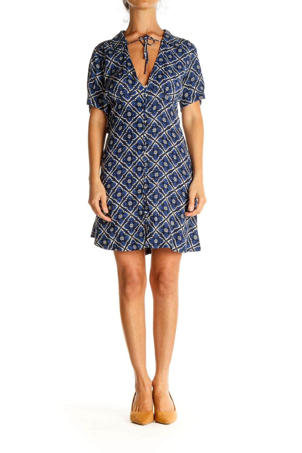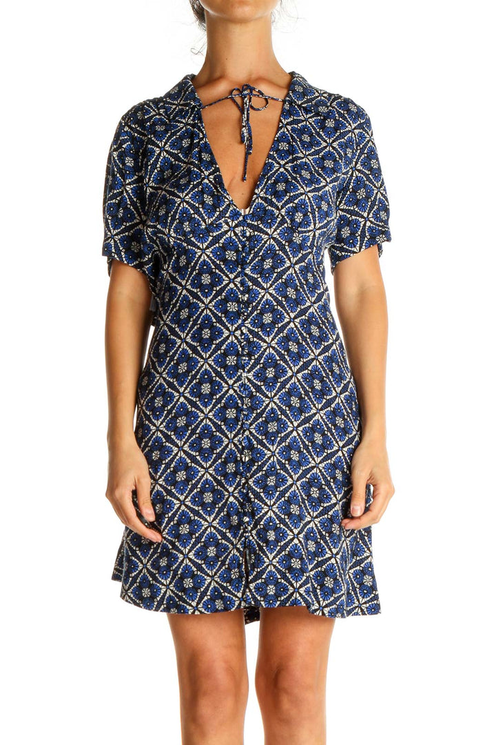 Step into boho-chic style with this captivating Free People dress in a mesmerizing blue geometric print. The short-sleeved design features a flattering V-neckline with a charming tie detail, perfect for adjusting your desired fit. The dress showcases a striking diamond pattern with intricate floral motifs, creating a visually appealing and unique look.