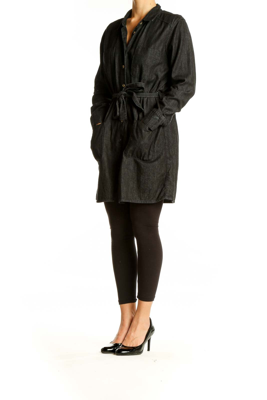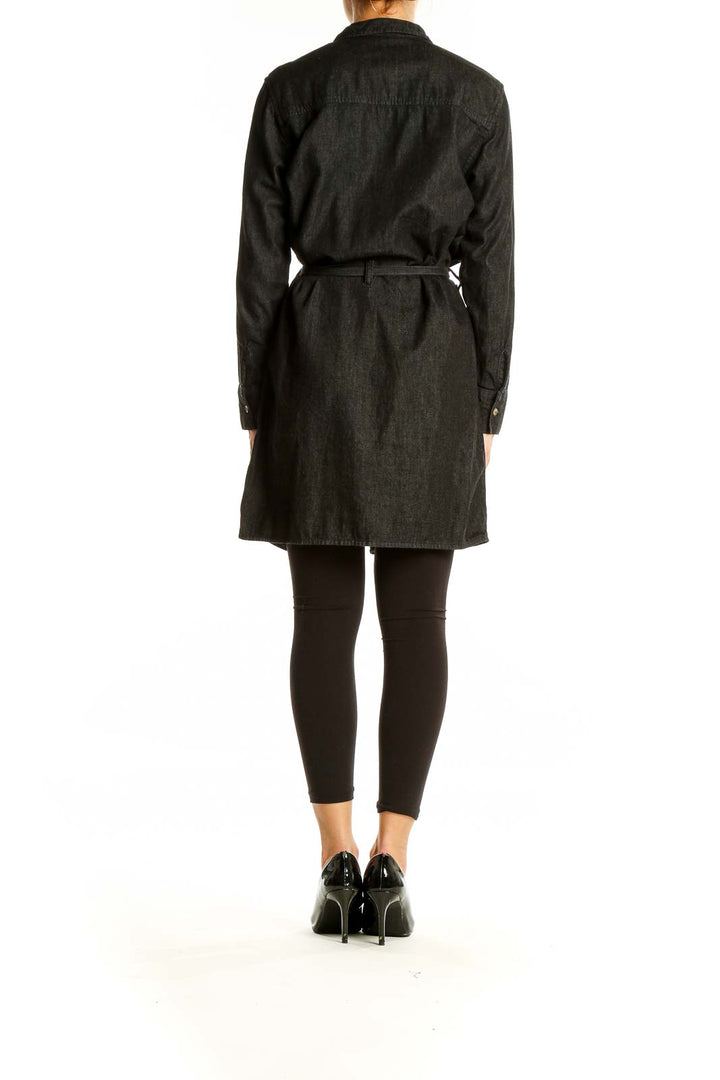 Elevate your casual wardrobe with this versatile black cotton shirt dress from ASOS. Perfect for any occasion, this dress features a classic button-up front, collar, and long sleeves for a timeless look. The tie waist belt allows you to cinch in your silhouette for a flattering fit, while the lightweight cotton fabric ensures all-day comfort. With its excellent condition and quality construction, this dress is a must-have addition to your closet. The knee-length cut and relaxed fit make it suitable for both work and weekend wear. Pair it with sneakers for a laid-back look or dress it up with heels for a more polished ensemble.