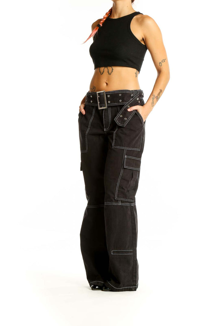 Make a bold statement with these eye-catching black cargo pants from ASOS. Featuring distinctive white contrast stitching throughout, these pants offer a unique twist on a classic style. The wide-leg silhouette and cargo pockets add a trendy, utilitarian edge to your outfit. Crafted from durable cotton, they provide both comfort and style for all-day wear. The pants come with a matching belt, complete with silver-toned eyelets, adding an extra touch of edgy detail. Perfect for those who love to stand out, these pants are versatile enough for both casual outings and more styled looks. In excellent condition, they're a must-have addition to any fashion-forward wardrobe.