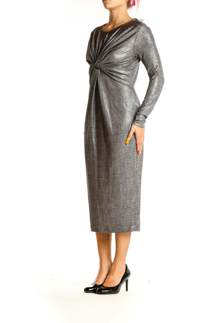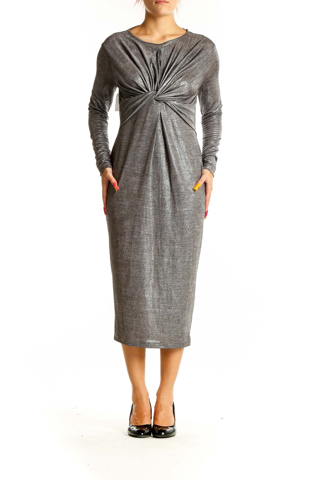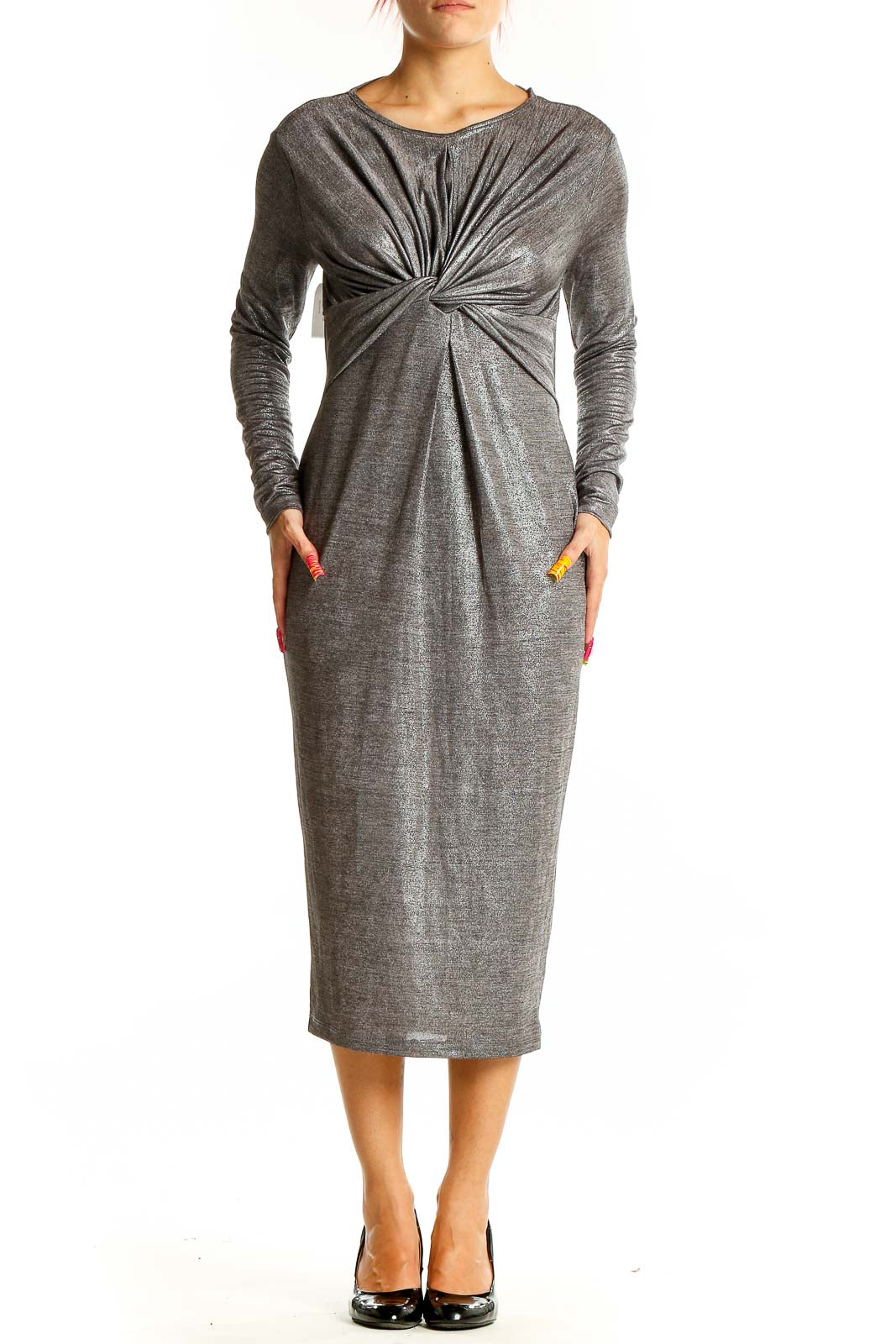 Elevate your style with this stunning gray midi dress from ASOS. Crafted from a luxurious blend of polyester and elastane, this dress offers both comfort and sophistication. The eye-catching twist-front detail adds a touch of elegance, creating a flattering silhouette that's perfect for various occasions.