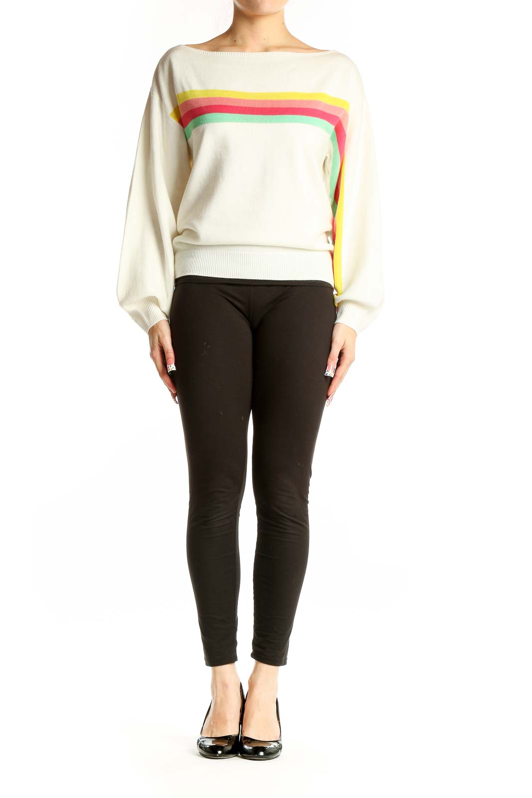 Elevate your casual wardrobe with this charming white acrylic knit sweater from ASOS. Featuring a playful striped design in vibrant yellow, coral, and mint hues across the chest, this sweater adds a pop of color to any outfit. The boat neckline and relaxed fit create a flattering silhouette, while the long balloon sleeves add a touch of elegance.