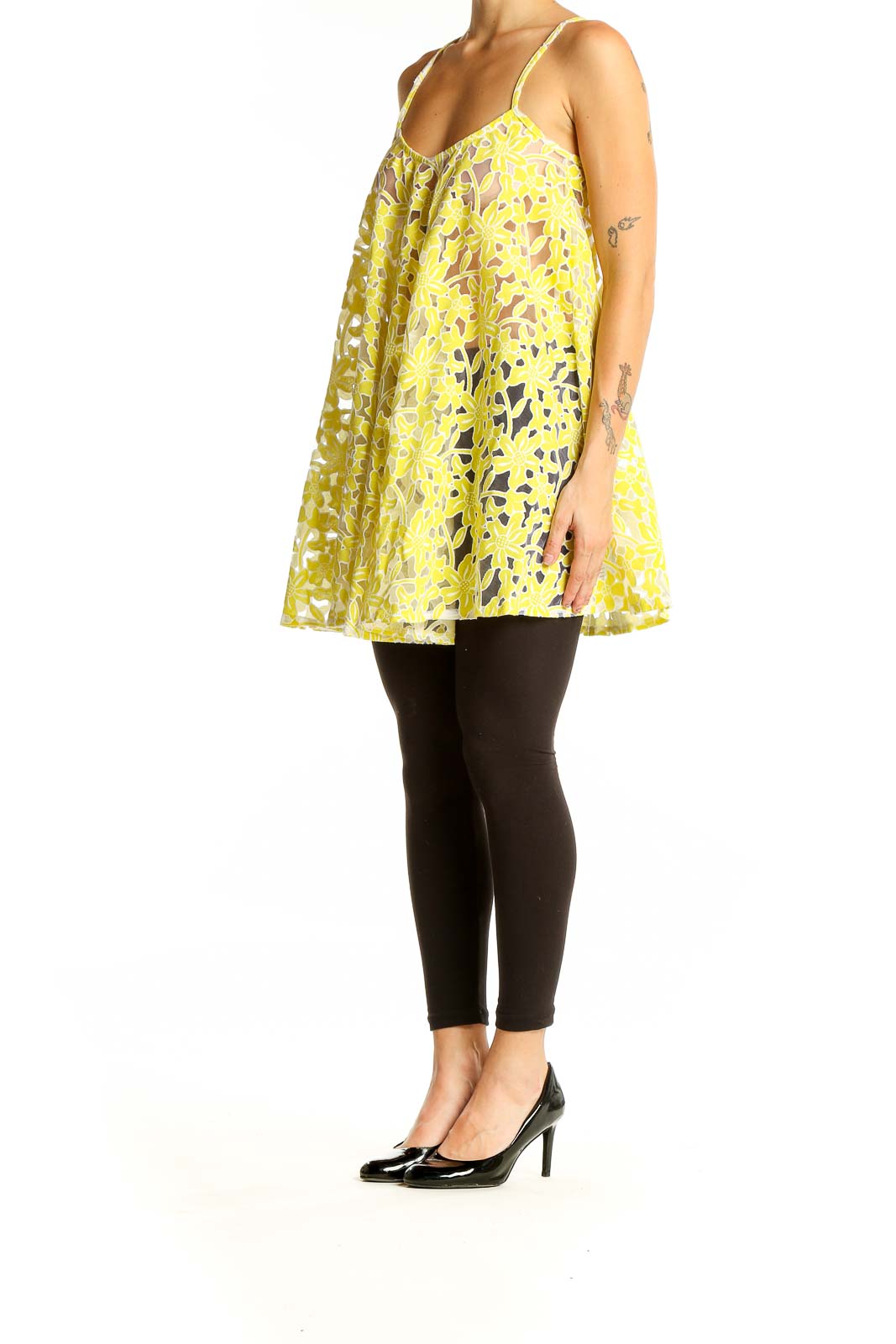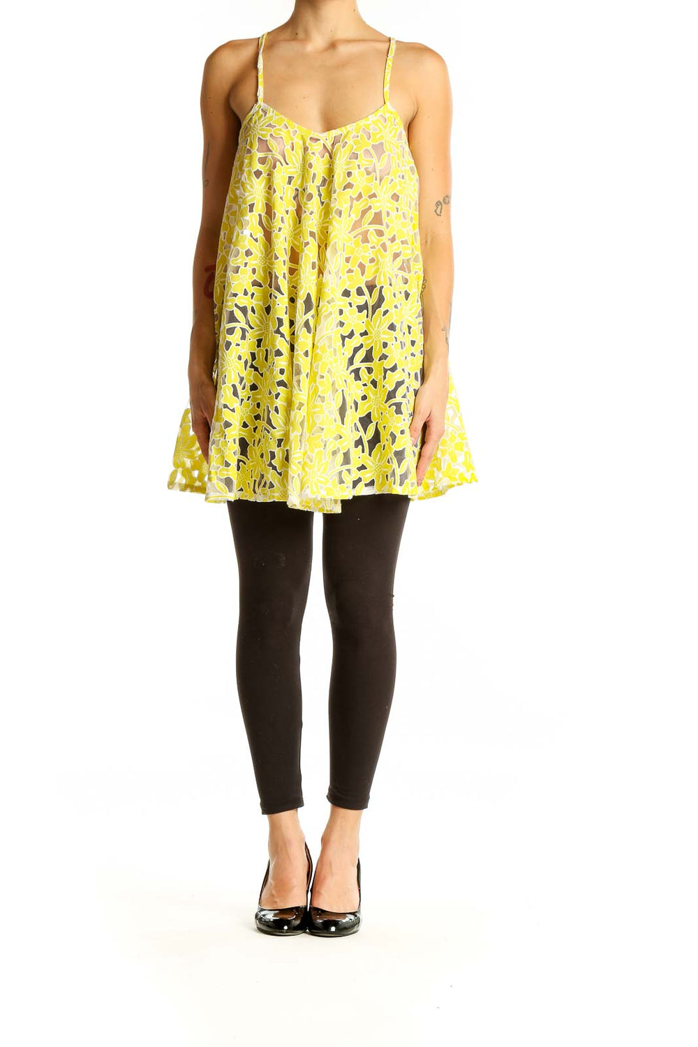 Make a statement with this vibrant yellow floral lace swing cami top from ASOS. The delicate floral lace pattern creates an eye-catching and feminine look, perfect for warm summer days or layering under a jacket for evening wear. The swing silhouette offers a flattering and comfortable fit, flowing gracefully from the bust to create a breezy, carefree style. Thin adjustable straps and a sweetheart neckline add a touch of elegance, while the sheer overlay adds depth and intrigue to the design. The polyester material ensures durability and easy care. This top is in excellent condition, ready to become a versatile staple in your wardrobe. Pair it with jeans for a casual look or dress it up with a skirt for a night out.