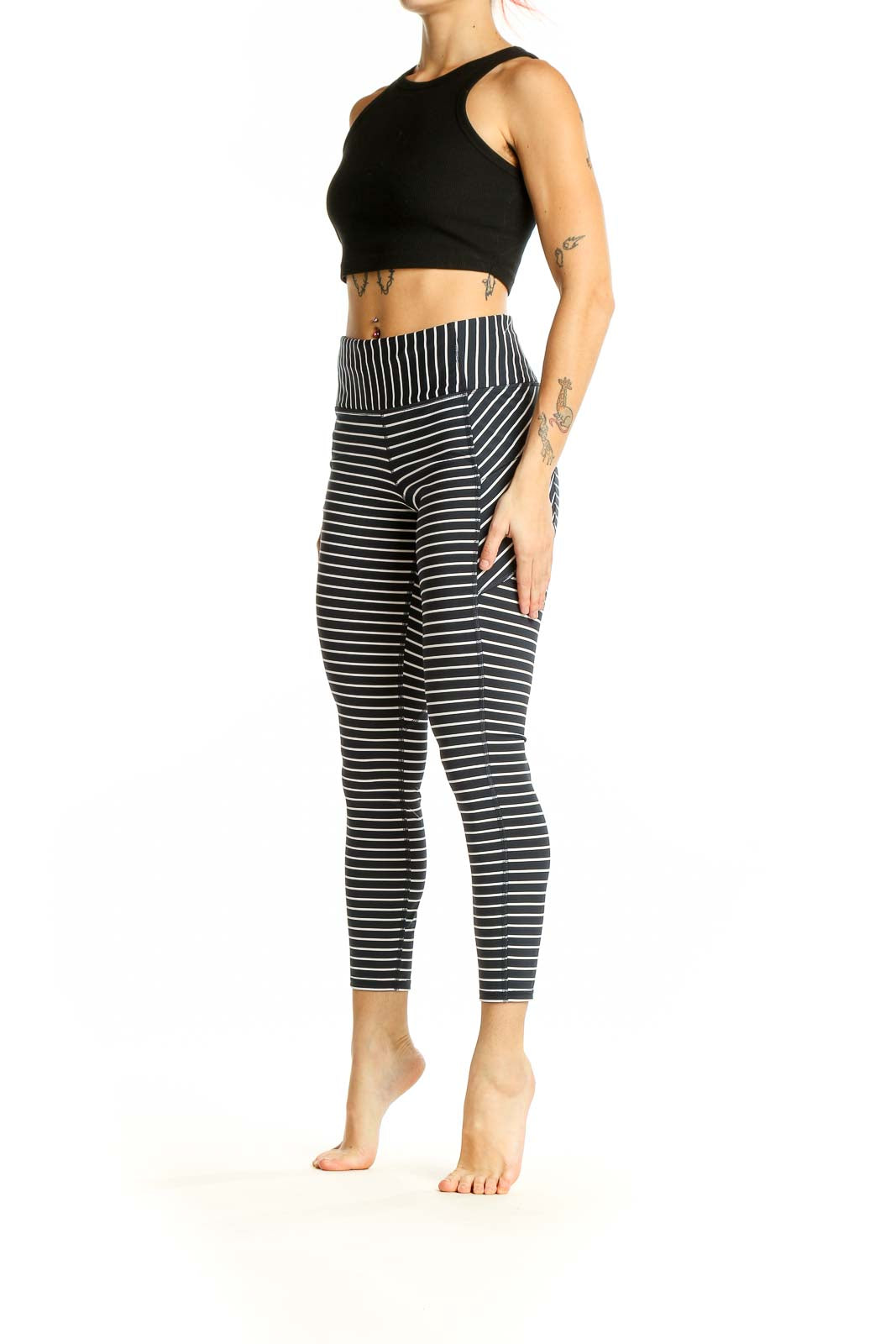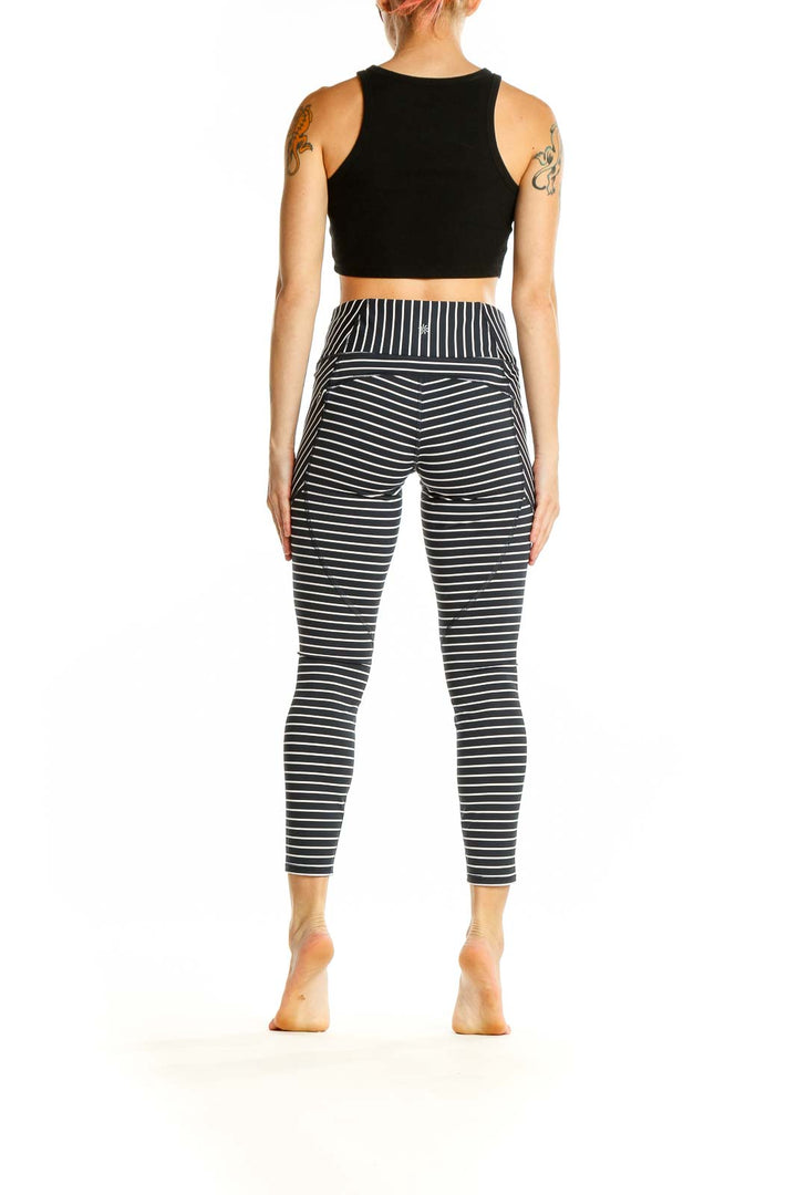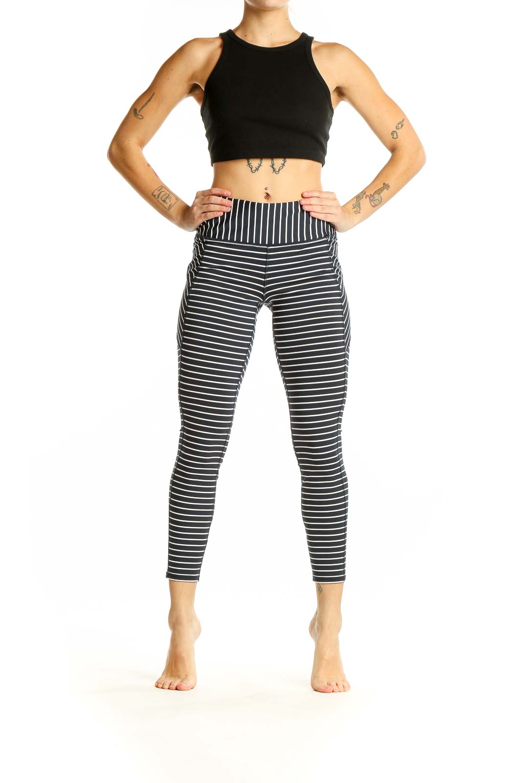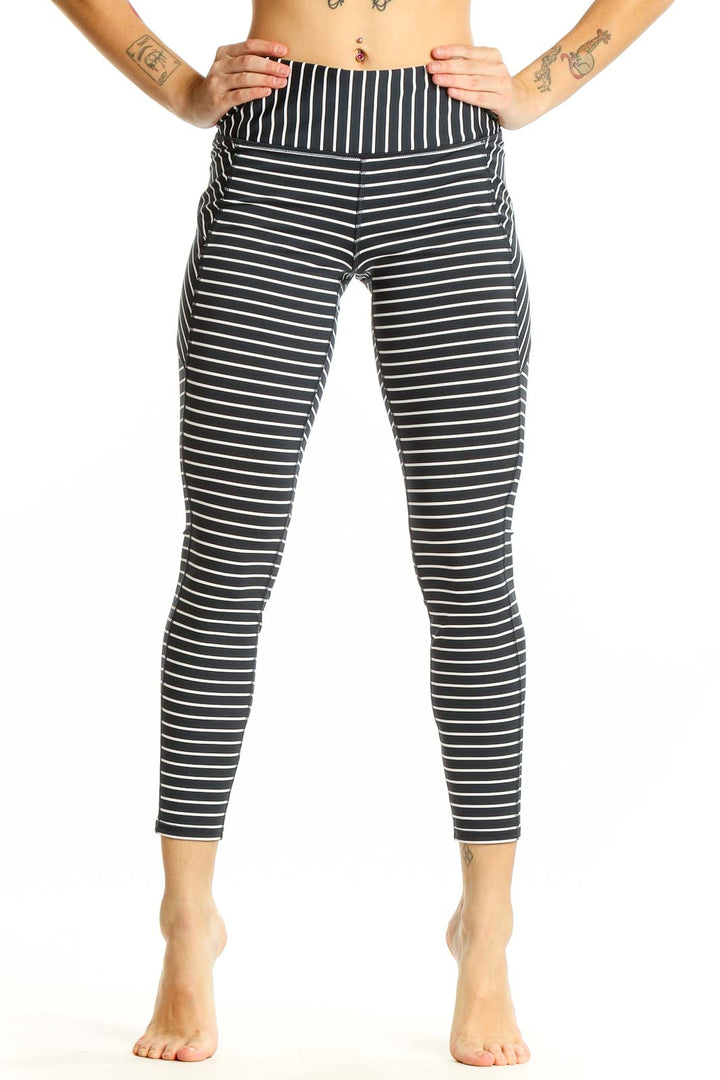 Step up your workout game with these sleek and stylish black and white striped athletic leggings from Athleta. Crafted from a high-performance blend of polyester and Lycra® Spandex, these leggings offer the perfect balance of comfort and flexibility for all your fitness activities. The horizontal stripe pattern adds a trendy touch to your athletic wardrobe, making you stand out at the gym or during your outdoor runs.