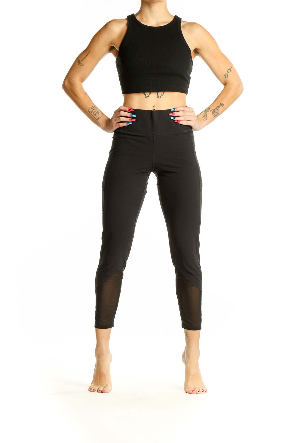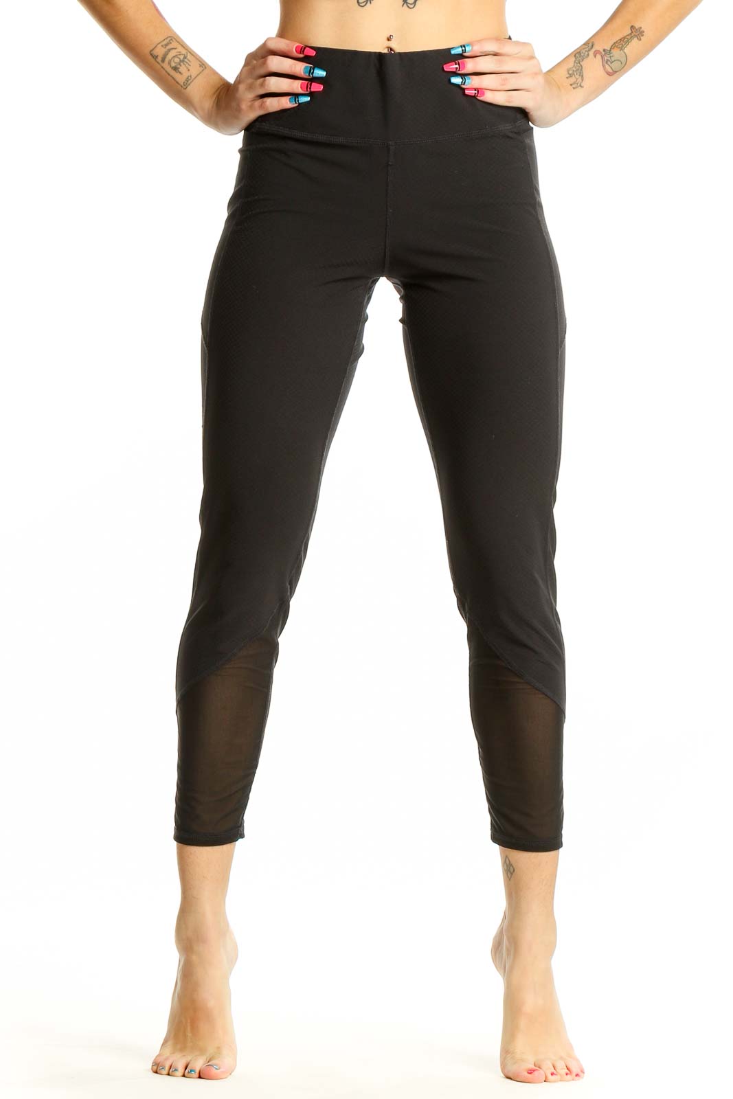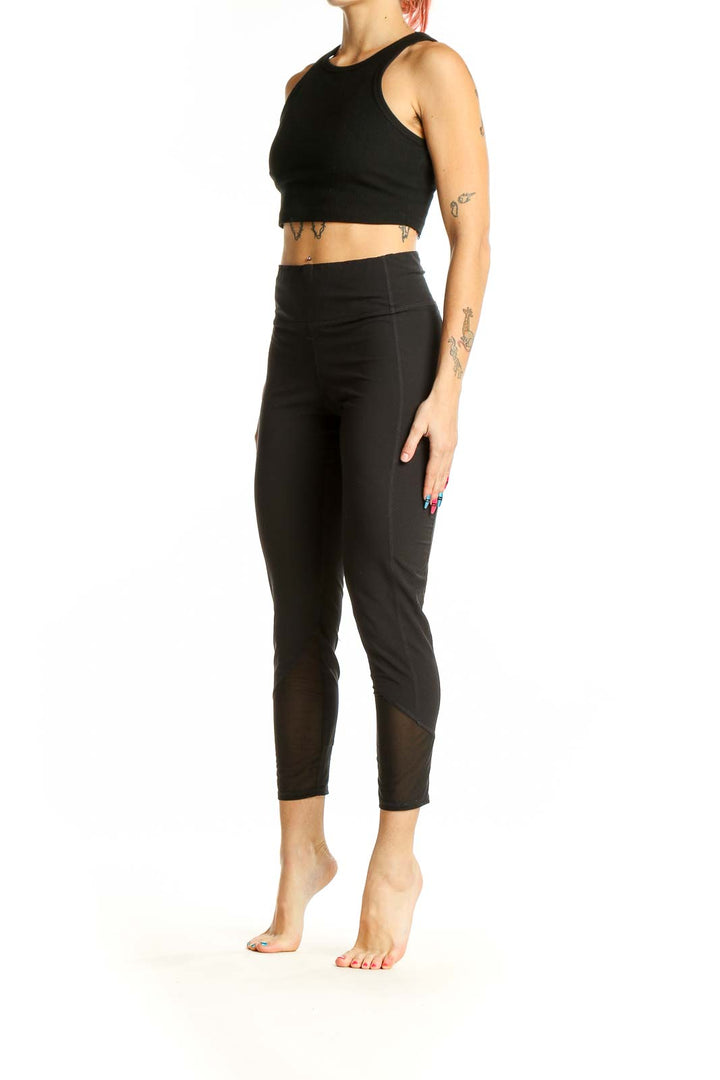 Featuring stylish mesh panels along the lower legs, these leggings not only look great but also provide enhanced breathability during intense workouts. The high-waisted cut offers tummy control and a flattering silhouette. With a cropped length that hits just above the ankle, these leggings are perfect for showing off your favorite training shoes.