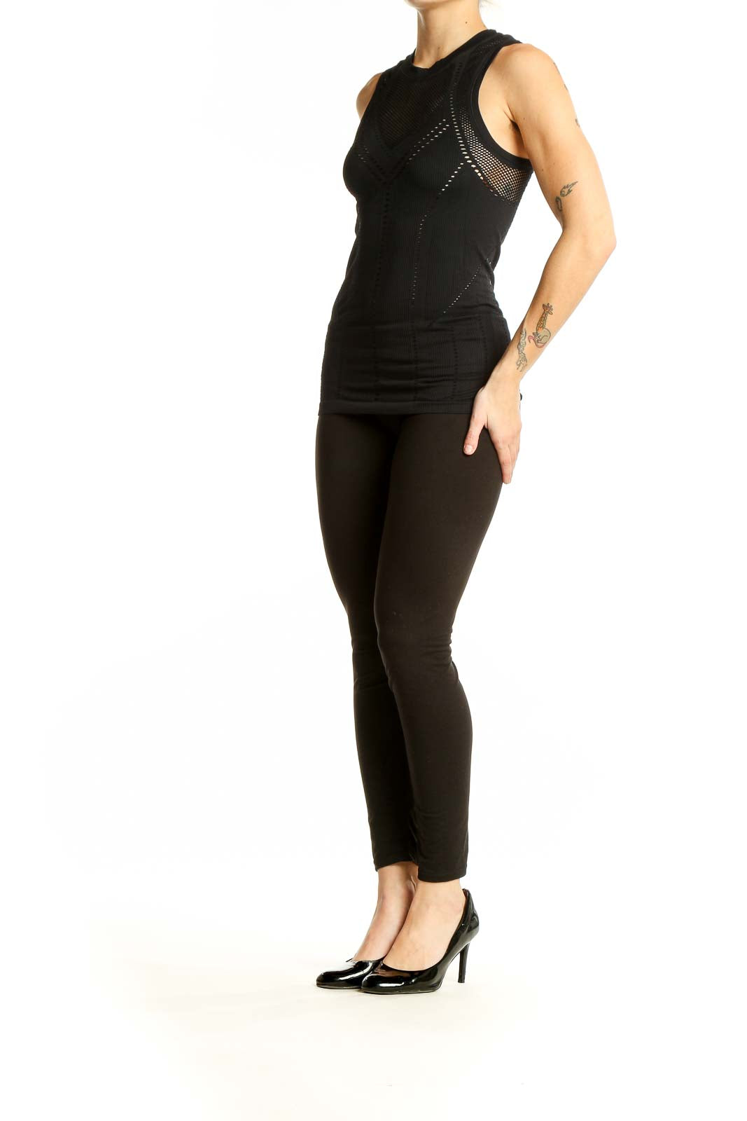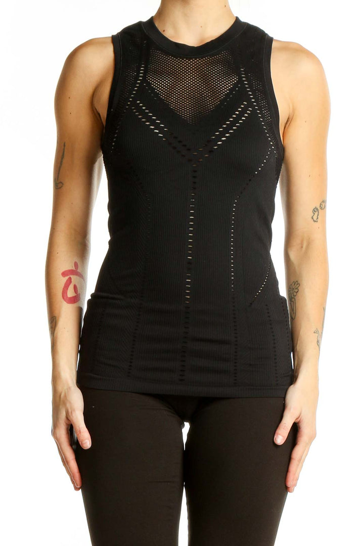 Elevate your workout wardrobe with this sleek black performance tank top from Athleta. Crafted from a high-quality blend of nylon and spandex, this top offers the perfect balance of comfort and functionality. The seamless construction and strategically placed mesh panels provide excellent ventilation and unrestricted movement, making it ideal for high-intensity workouts or yoga sessions.