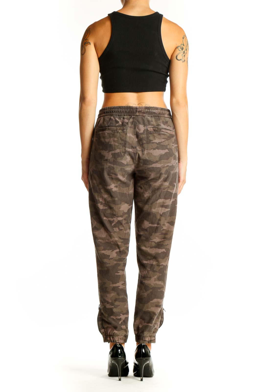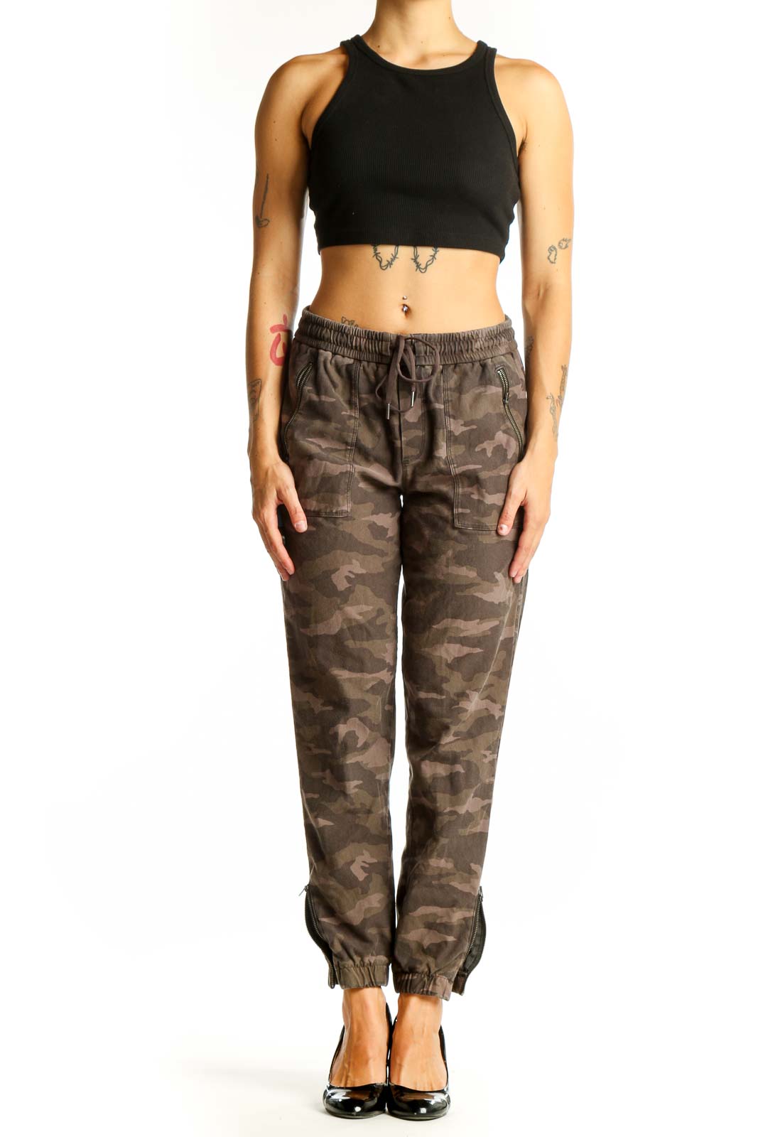 Step into style and comfort with these trendy camo jogger pants from Athleta. Crafted from a soft and stretchy blend of cotton and spandex, these pants offer the perfect balance of casual cool and athletic functionality. The brown camouflage pattern adds an edgy, urban flair to your wardrobe, making them versatile for both workout sessions and casual outings.