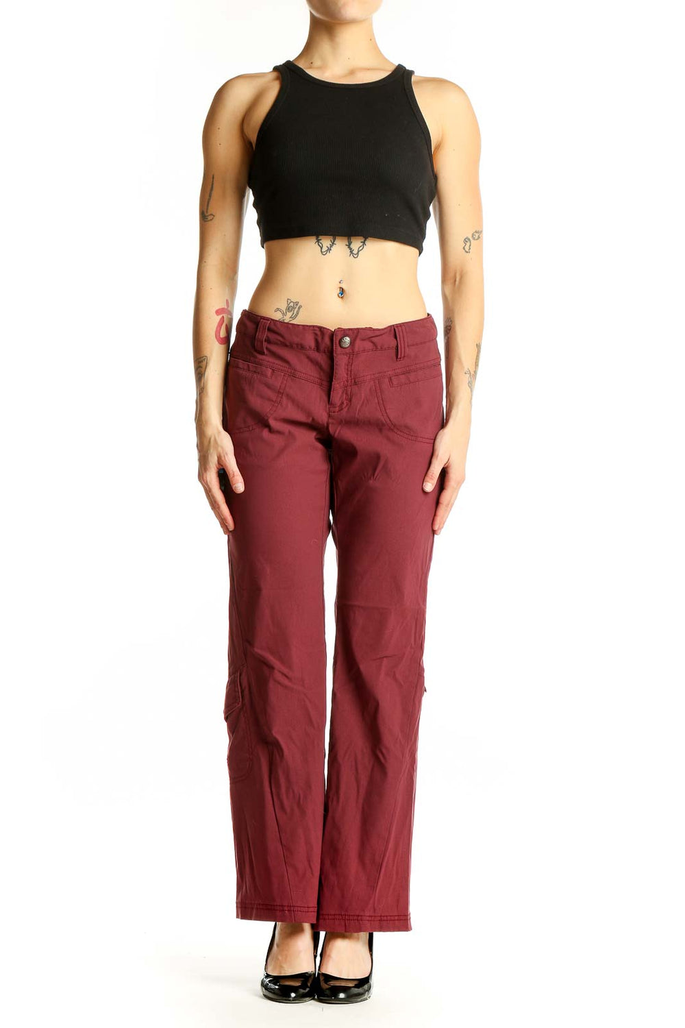 Designed with functionality in mind, these pants feature a mid-rise waist and a clean, streamlined appearance. The rich burgundy color adds a sophisticated touch to your wardrobe, easily pairable with a variety of tops. With measurements of 38" hips, 36" length, and a 34" waist, these medium-sized pants offer a comfortable fit for many body types.