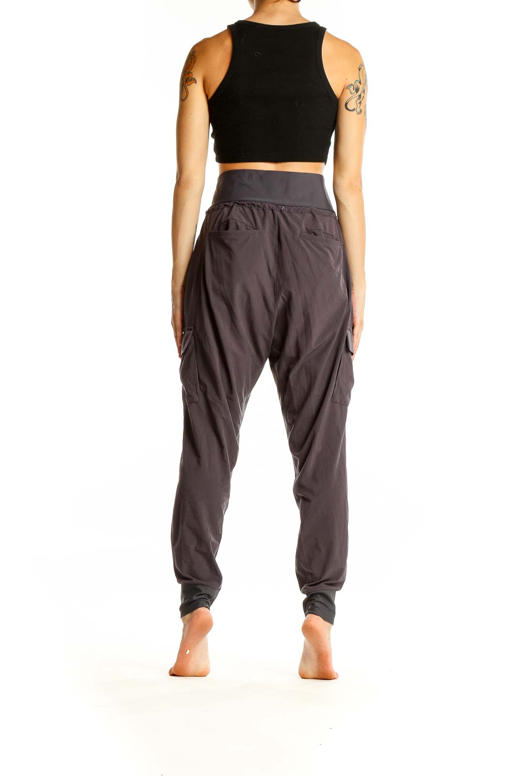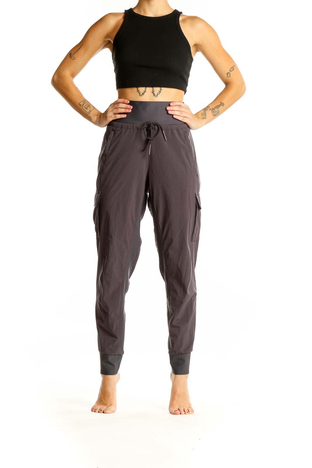 Elevate your activewear collection with these sleek gray high-waisted cargo joggers from Athleta. Crafted from a comfortable blend of polyester and spandex, these pants offer both flexibility and durability for your active lifestyle. The high-waisted design provides excellent coverage and support, while the drawstring waist ensures a perfect fit. Side cargo pockets add functionality without compromising style. The tapered leg and ribbed cuffs create a modern silhouette that transitions seamlessly from workout to casual wear. In excellent condition, these versatile joggers are perfect for yoga, running errands, or lounging at home.
