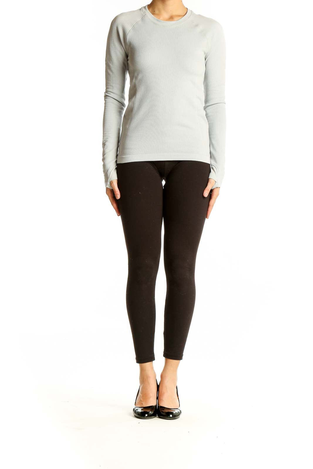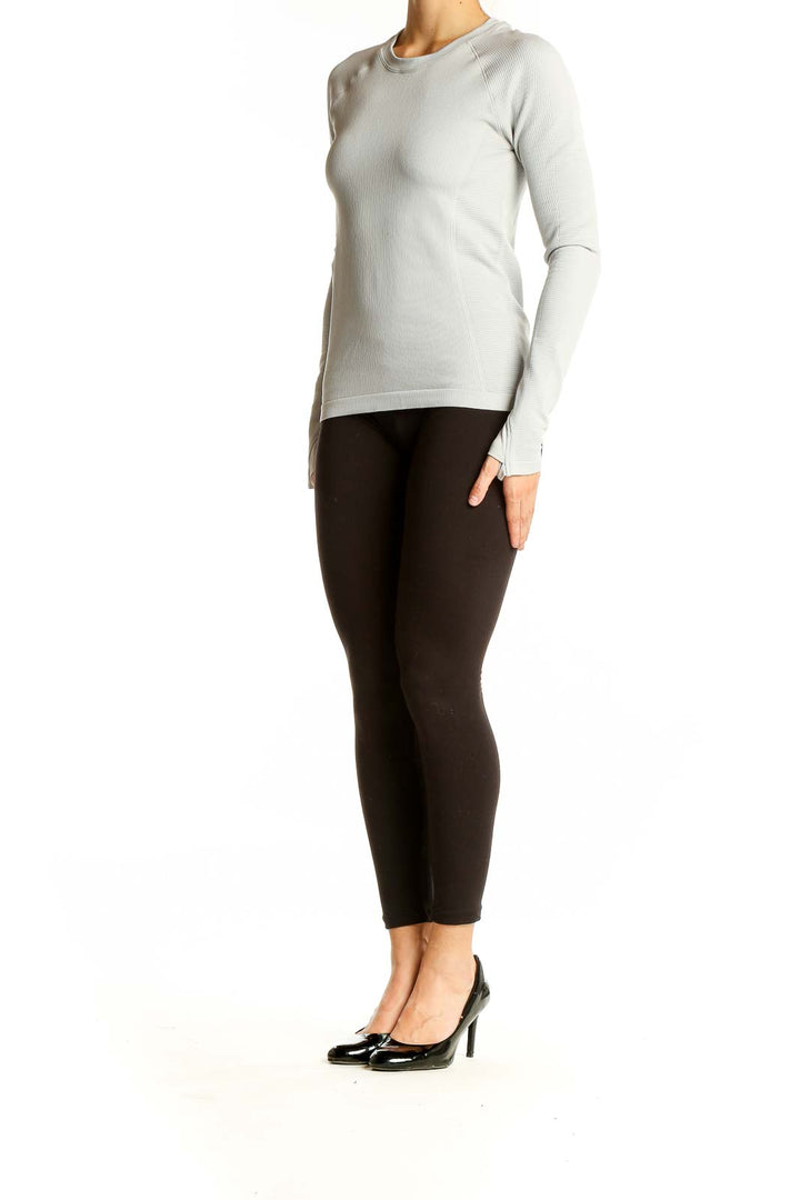 Designed with a form-fitting silhouette, this top accentuates your curves while allowing for a full range of motion. The crew neckline and long sleeves with thumb holes offer additional coverage and warmth, making it perfect for layering or wearing on its own. The subtle light gray color is versatile and easy to pair with your favorite workout bottoms.