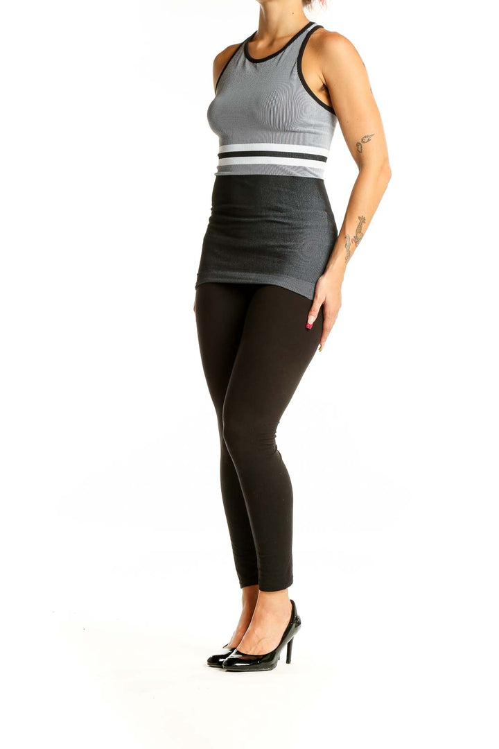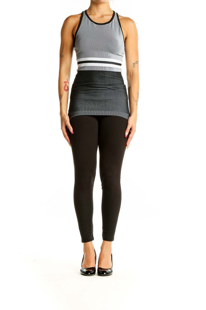 Elevate your workout wardrobe with this sleek and stylish gray striped racerback tank top from Athleta. Crafted from a high-performance blend of nylon and spandex, this top offers both comfort and flexibility for all your athletic pursuits. The form-fitting design features a striking contrast of light gray and black stripes, creating a visually slimming effect.