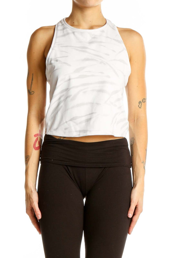 Elevate your workout wardrobe with this stylish and functional cropped tank top from Athleta. Featuring a trendy white camouflage print, this top combines fashion with performance. The polyester-spandex blend offers both comfort and flexibility, perfect for your most intense workouts or casual athleisure wear.
