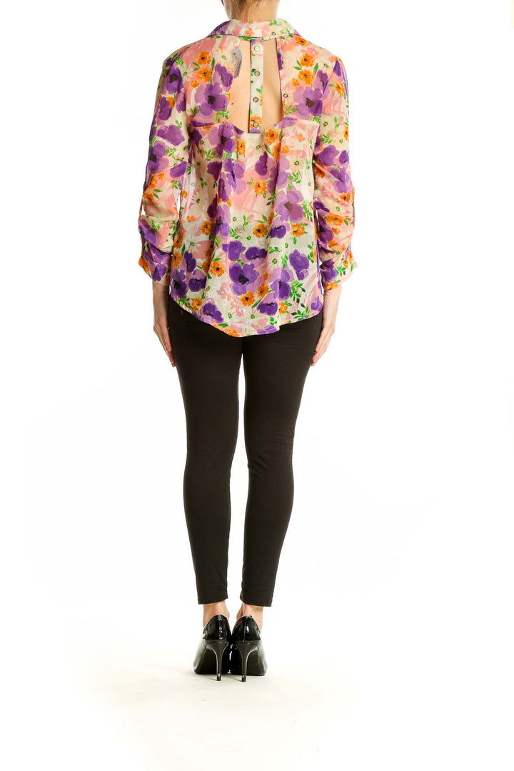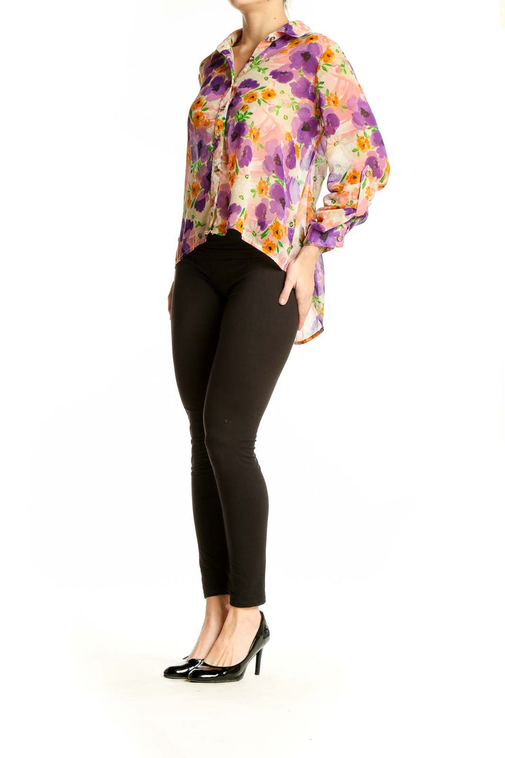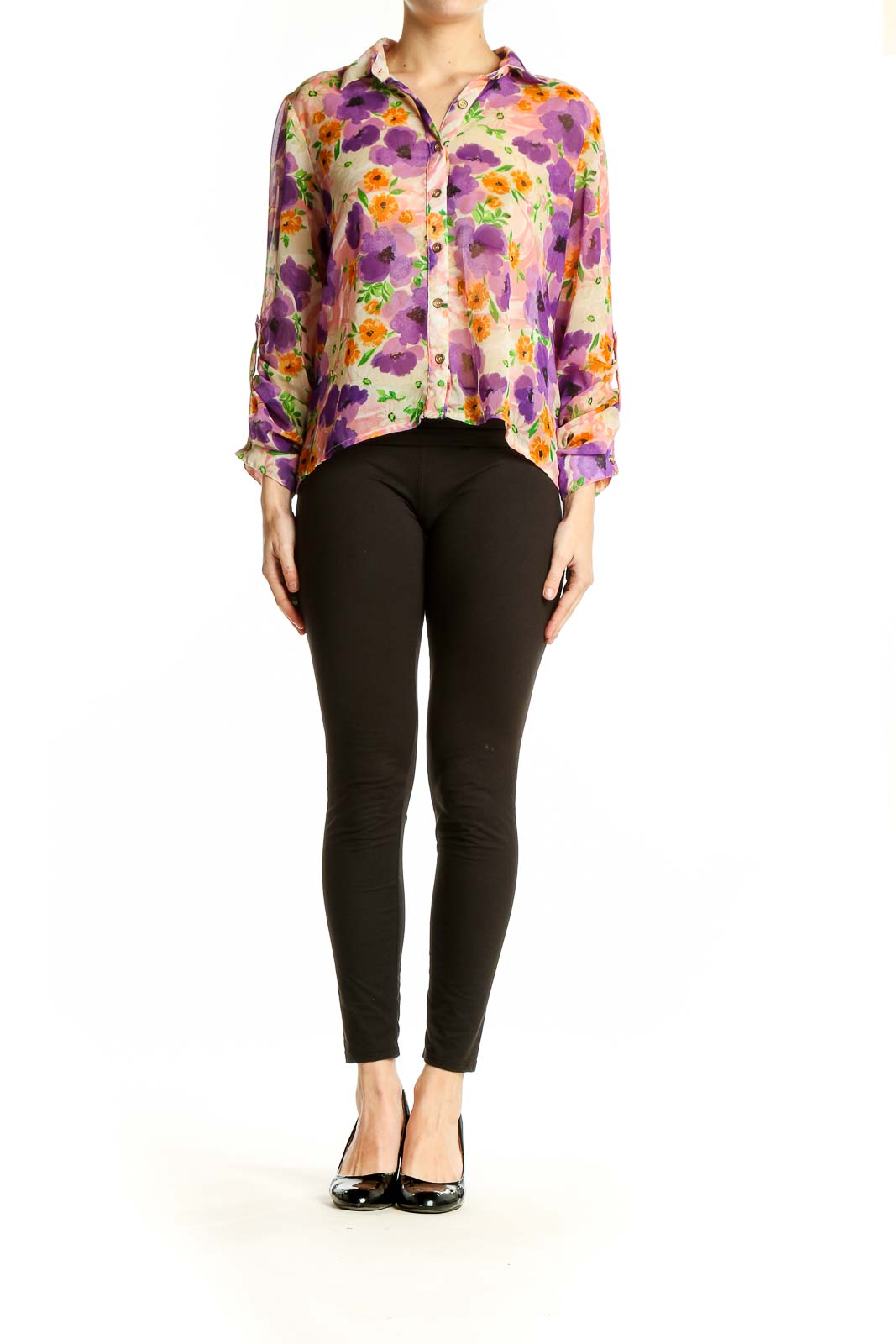 Embrace the beauty of spring with this enchanting purple floral button-down blouse from Band of Gypsies. The lightweight fabric showcases a vibrant pattern of purple and orange blooms against a soft, pastel background, perfect for adding a pop of color to your wardrobe. The relaxed fit and long sleeves with roll-up tabs offer versatility for various occasions.