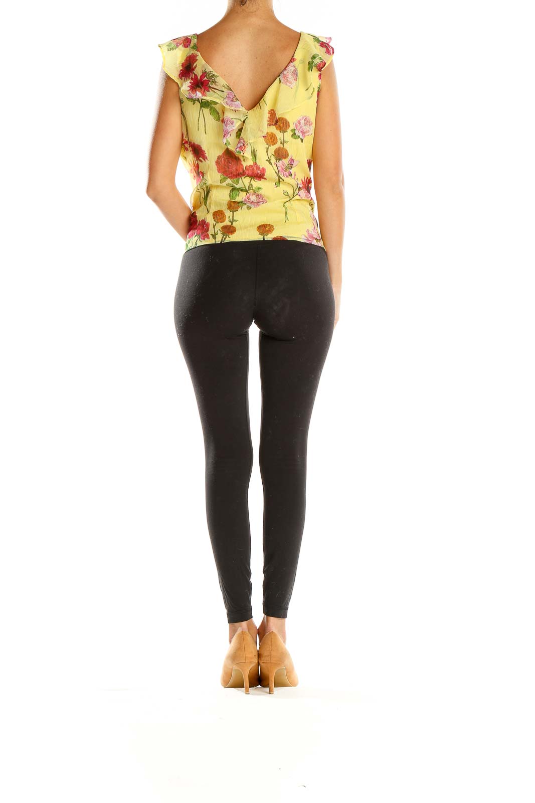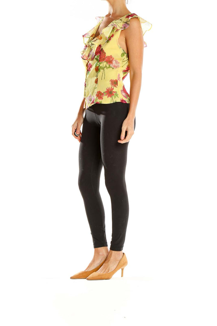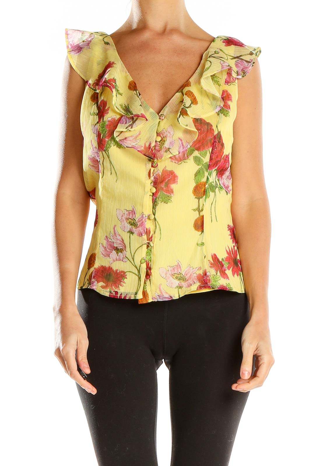 Embrace the beauty of spring with this charming yellow floral blouse by BB Dakota. The vibrant yellow background is adorned with a delightful array of red, pink, and purple flowers, creating a cheerful and feminine look. Ruffled cap sleeves add a touch of whimsy and romance to this sleeveless top.