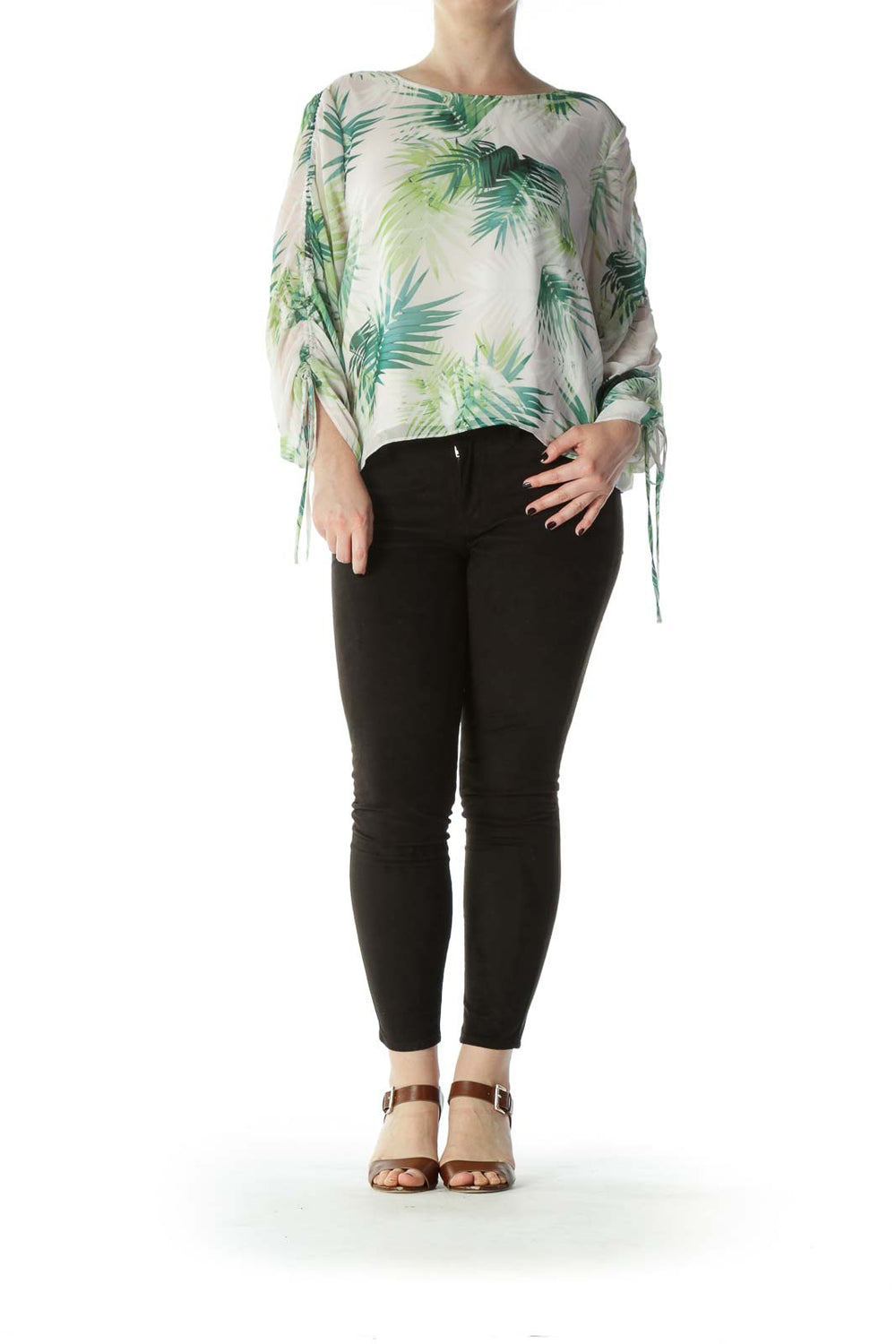 Green and White Tropical Print Blouse with Sleeve Drawstring Detail