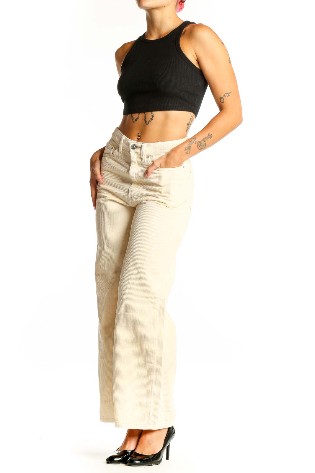 Side view of woman wearing BDG cream corduroy wide-leg pants with black top