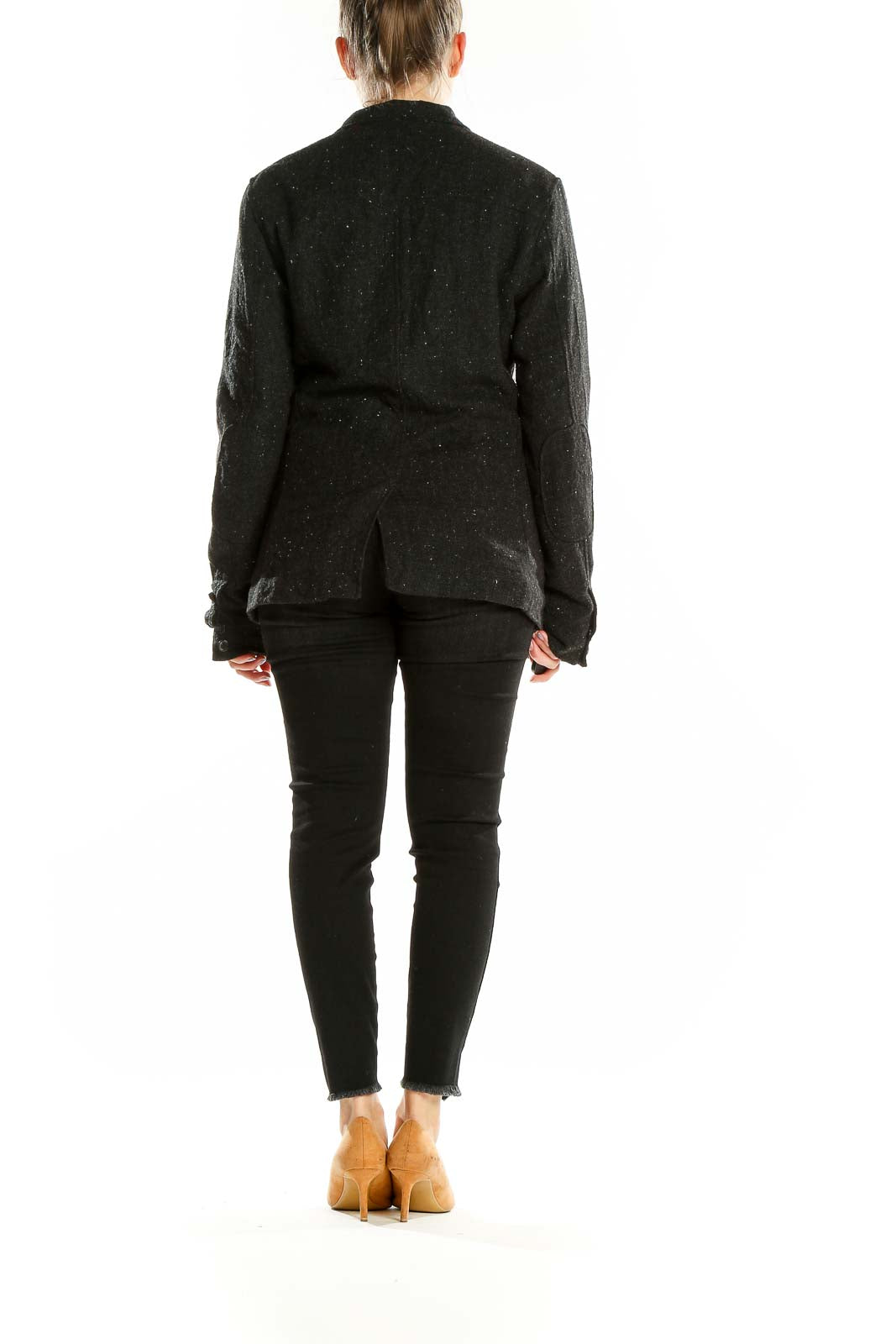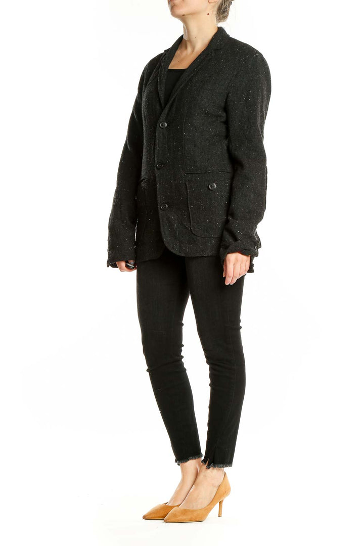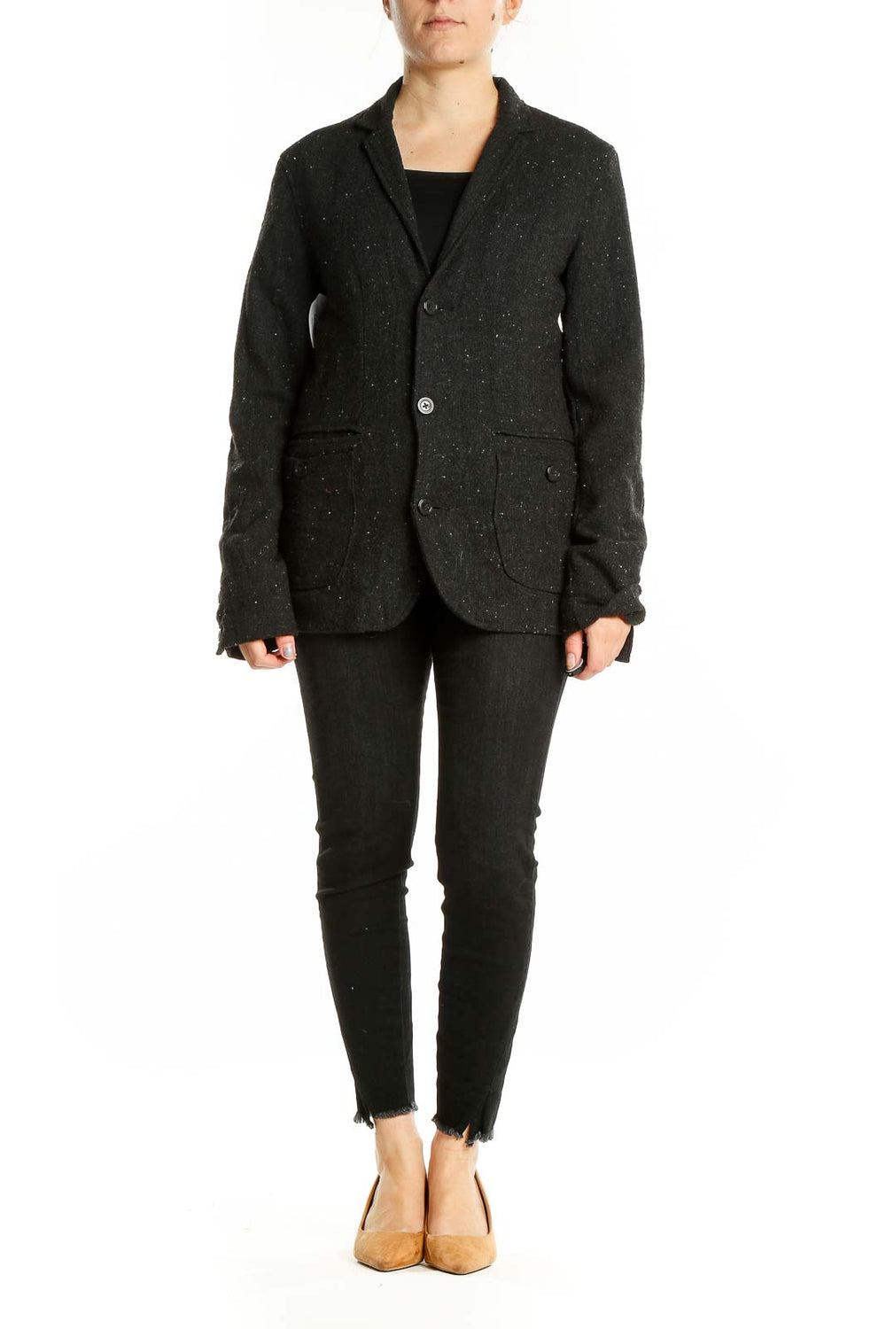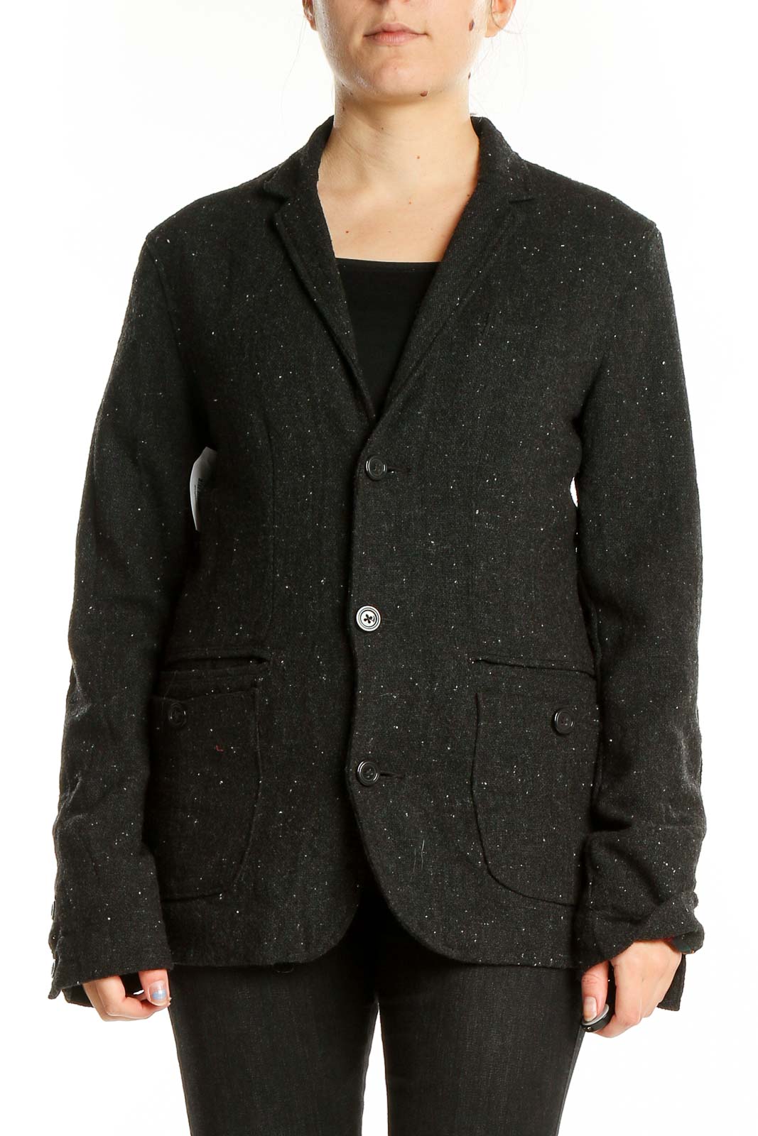 Designed with a classic silhouette, this blazer features a notched lapel collar, two-button front closure, and patch pockets that combine functionality with fashion. The excellent condition speaks to its quality and durability. With its versatile dark hue, this piece effortlessly transitions from day to night, making it a must-have for any fashion-forward individual.
