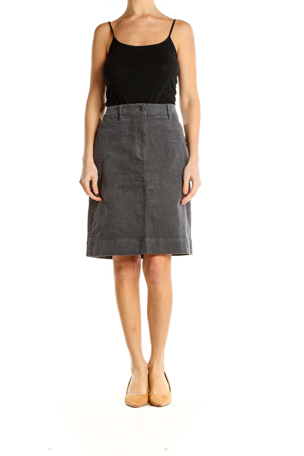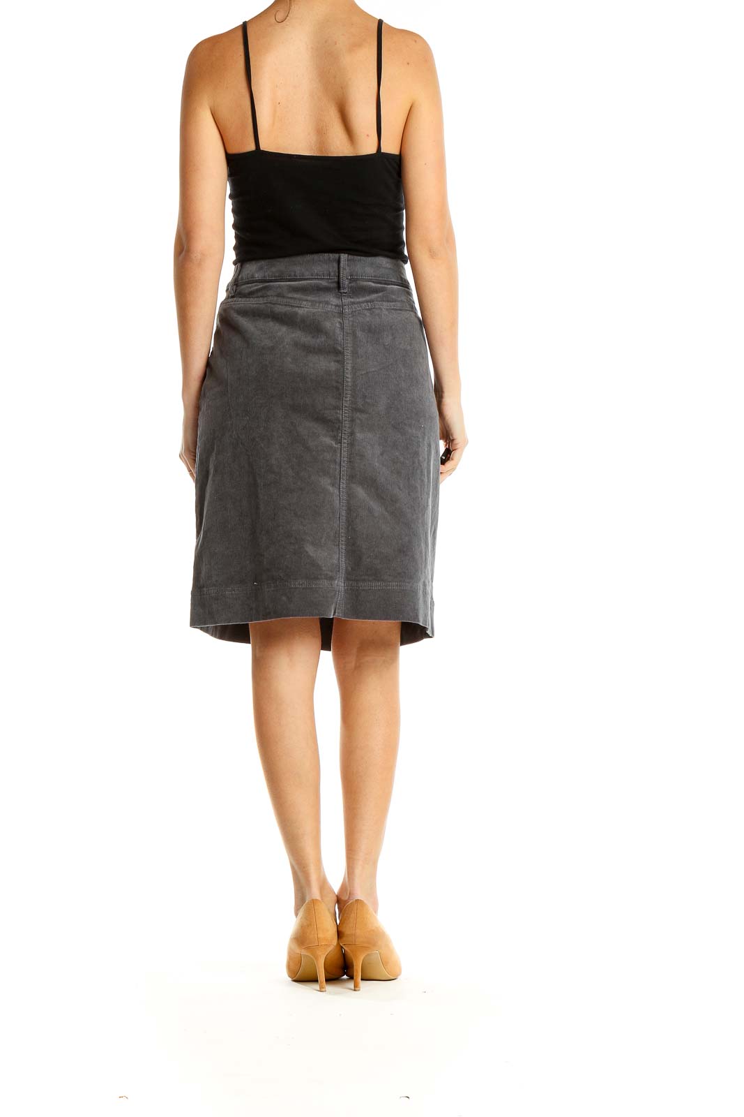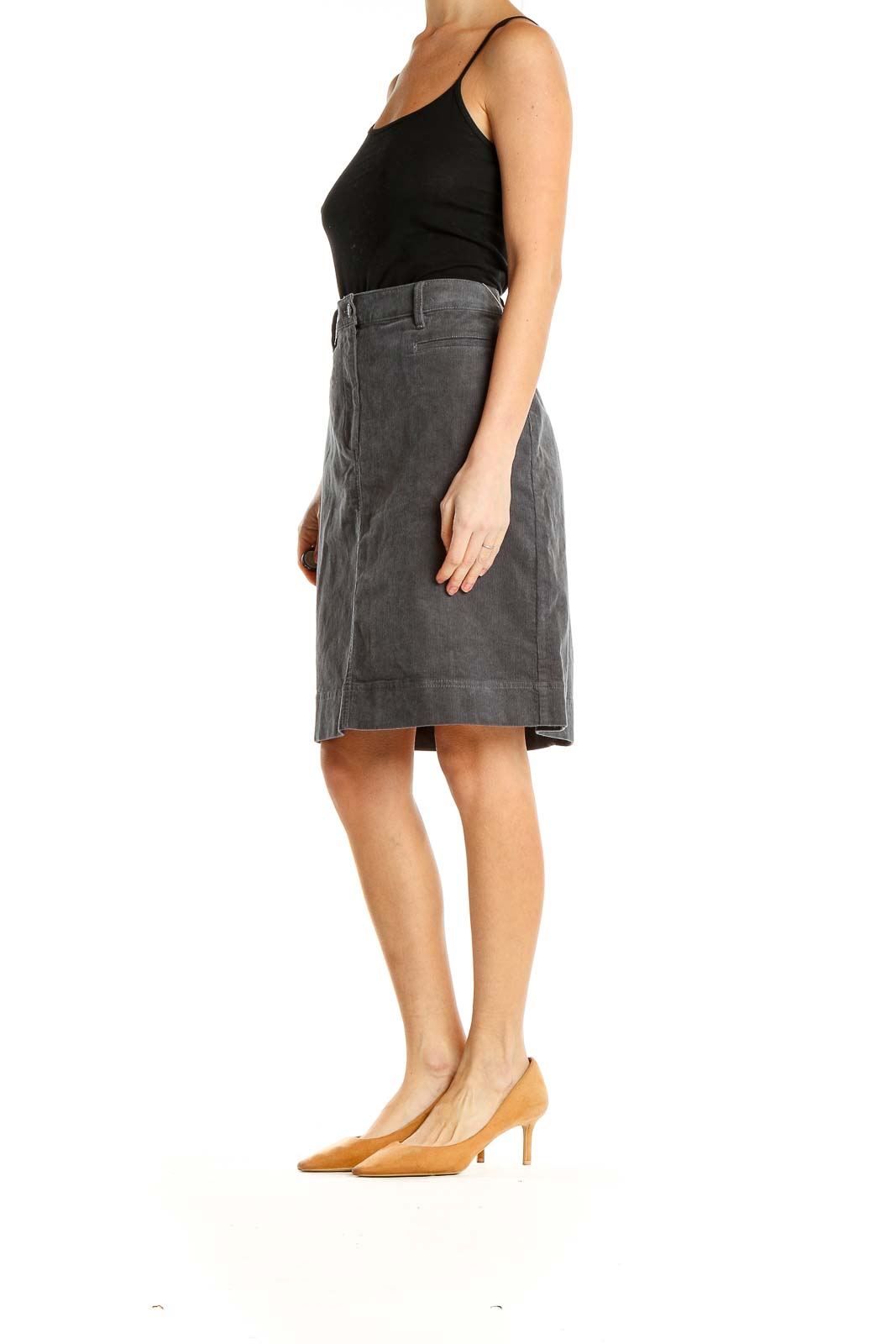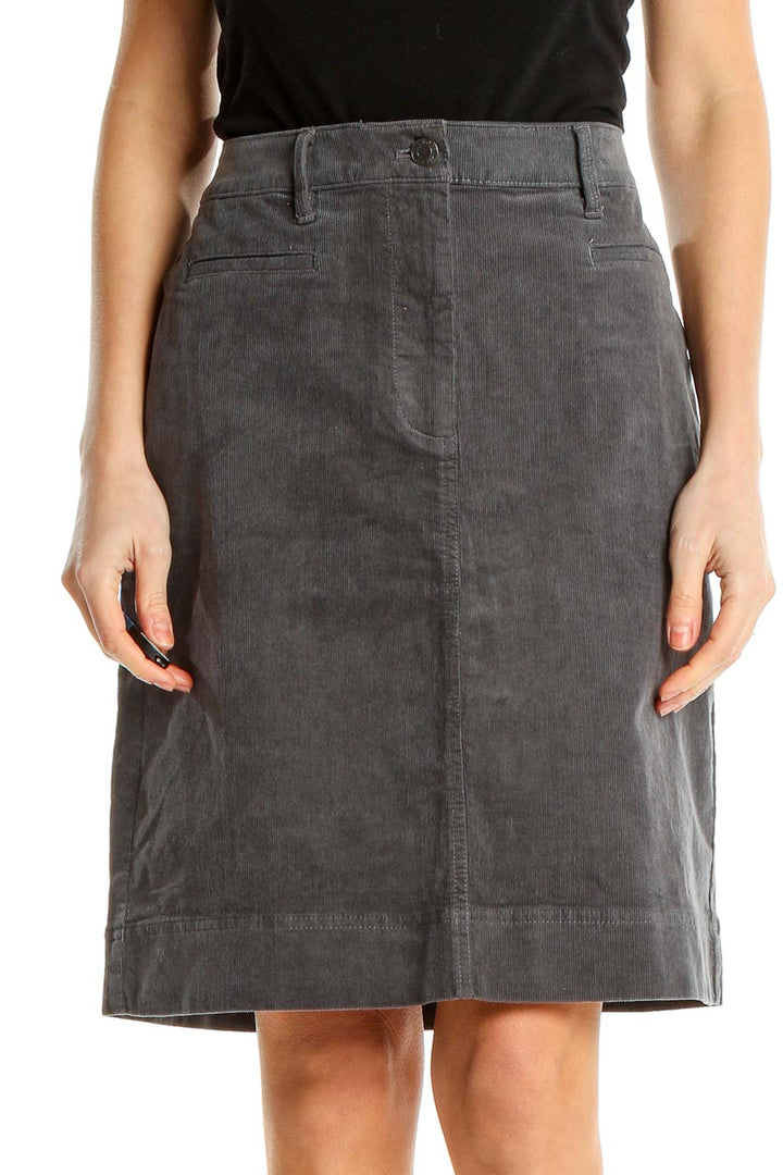 The skirt features a classic waistband with a single button closure and zip fly, ensuring a secure and comfortable fit. Side pockets add functionality without compromising the sleek lines of the garment. The rich gray hue is versatile, easily pairing with a variety of tops and accessories.