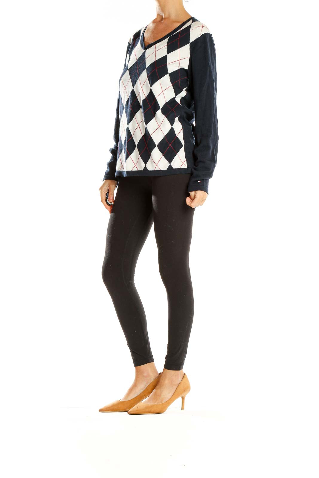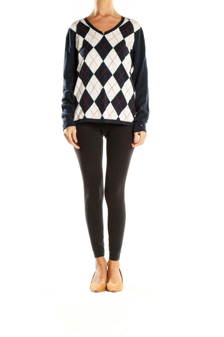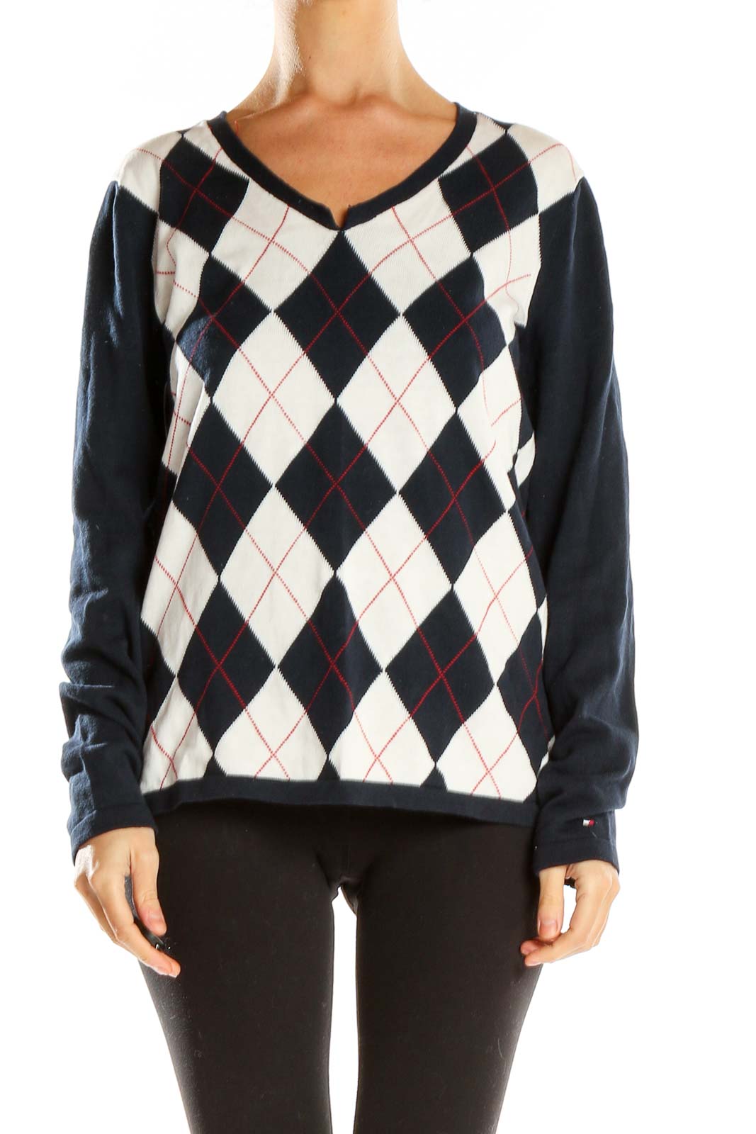 Elevate your casual wardrobe with this classic Navy and White Argyle V-Neck Sweater from Tommy Hilfiger. This timeless piece features a striking argyle pattern on the front, combining navy blue diamonds with white for a sophisticated look. The sweater's long navy sleeves and V-neckline add a touch of elegance to the traditional design.