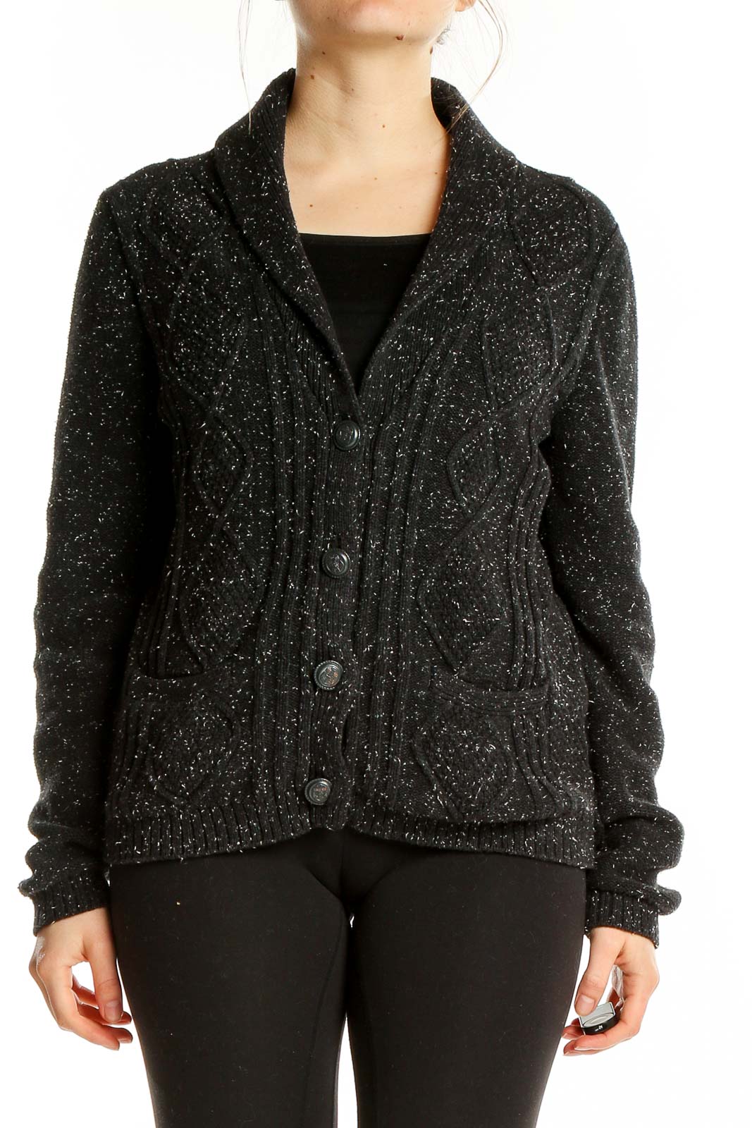 Wrap yourself in cozy comfort with this classic black speckled cardigan from Lands' End. Crafted from soft cotton, this versatile knit sweater features a timeless button-front design and a relaxed fit that's perfect for layering. The subtle white flecks throughout add a touch of visual interest to the rich black fabric.