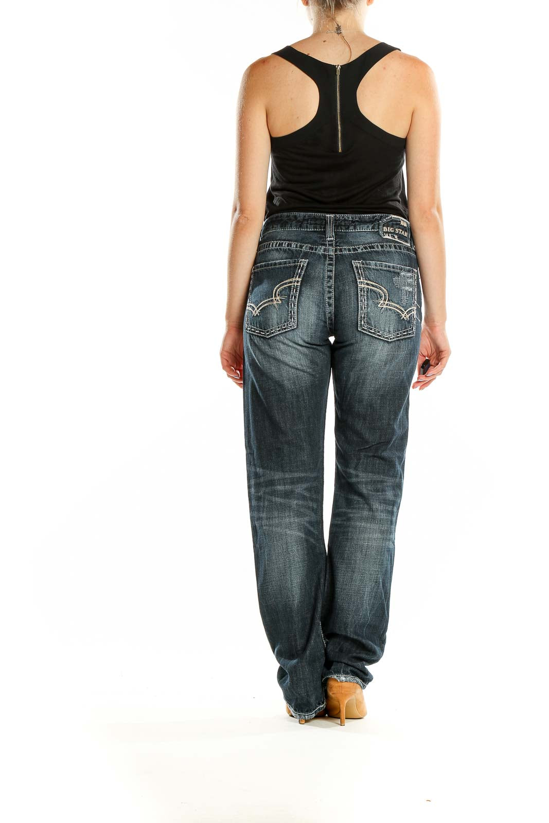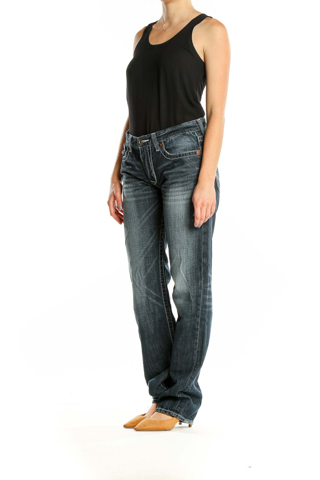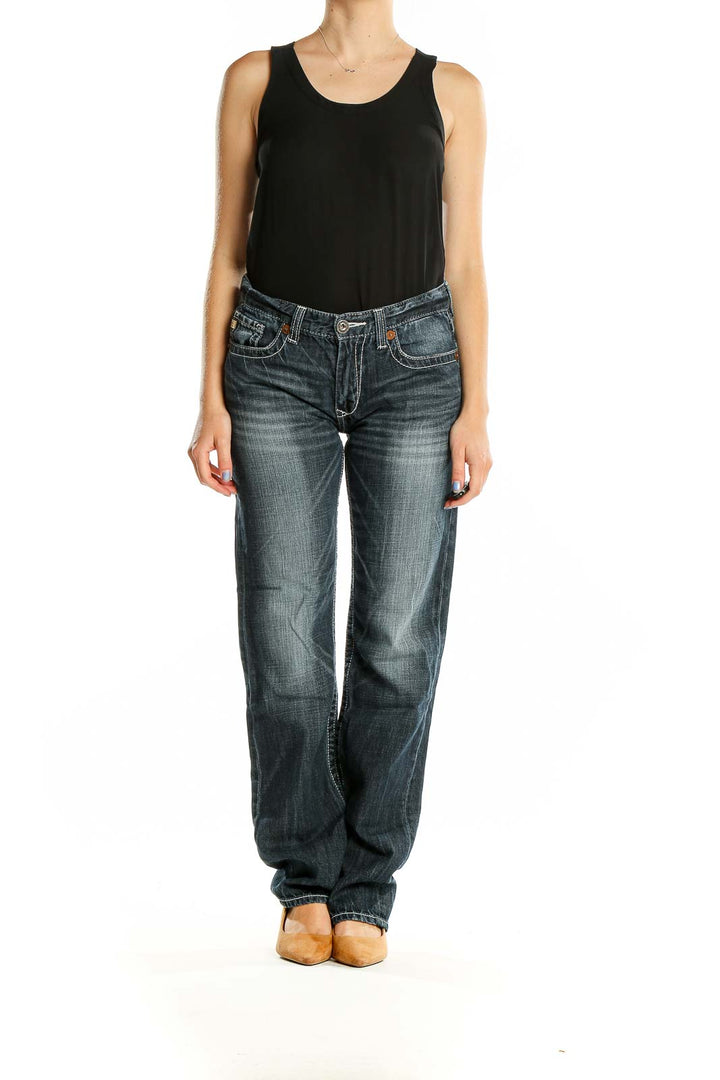 These jeans feature a versatile dark blue wash that pairs well with any outfit, from casual tees to dressier tops. The straight leg silhouette and mid-rise waist create a flattering look for various body types. Distinctive stitching on the back pockets adds a touch of flair to these otherwise classic jeans.