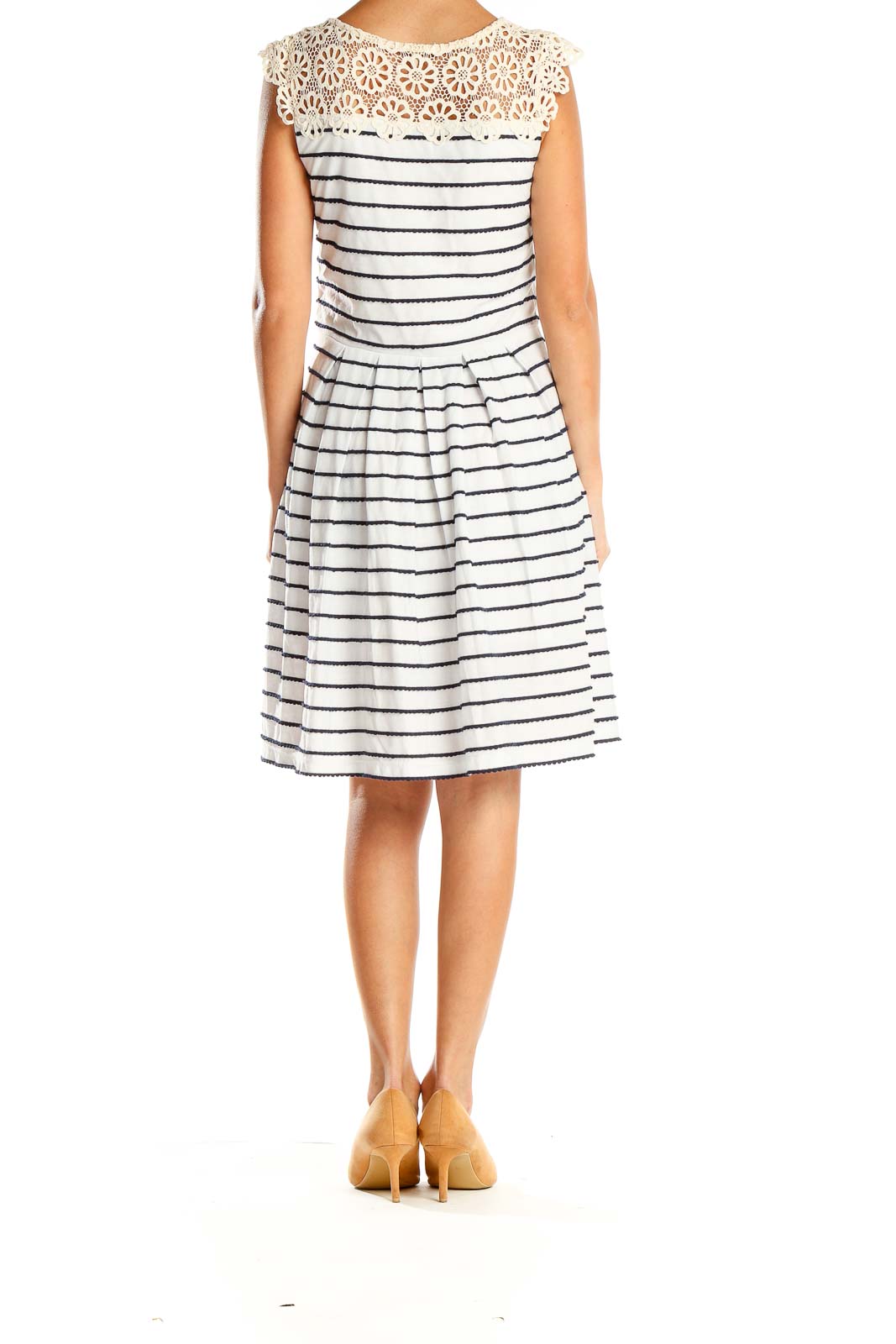 Elevate your casual-chic wardrobe with this charming white and navy striped dress by Bordeaux. The standout feature is its beautiful cream lace yoke, adding a touch of feminine elegance to the classic nautical-inspired design. The dress features a flattering fit-and-flare silhouette with a gathered waist, creating a lovely shape that suits various body types.