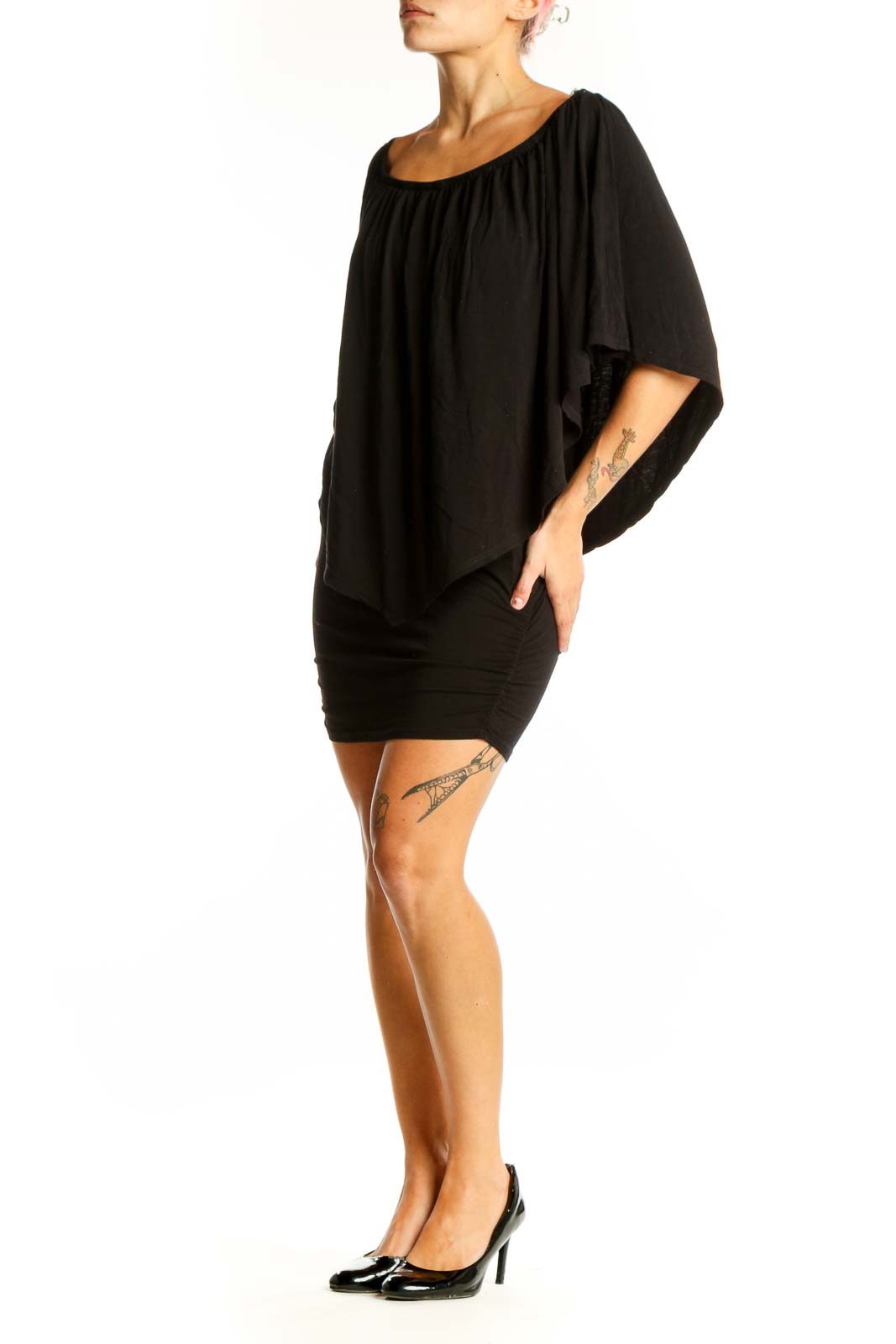 Make a statement in this chic black mini dress from Boston Proper. The elegant off-shoulder design features a flowy draped overlay that adds a touch of drama to your look. Crafted from a comfortable blend of spandex and viscose, this dress offers both style and ease of movement. The fitted silhouette hugs your curves in all the right places, while the overlay provides a flattering drape. Perfect for cocktail parties or evening events, this versatile piece can be dressed up or down with the right accessories. In excellent condition, this size small dress measures 38" in the bust, 34" in the waist, and 29" in length, ensuring a figure-flattering fit.