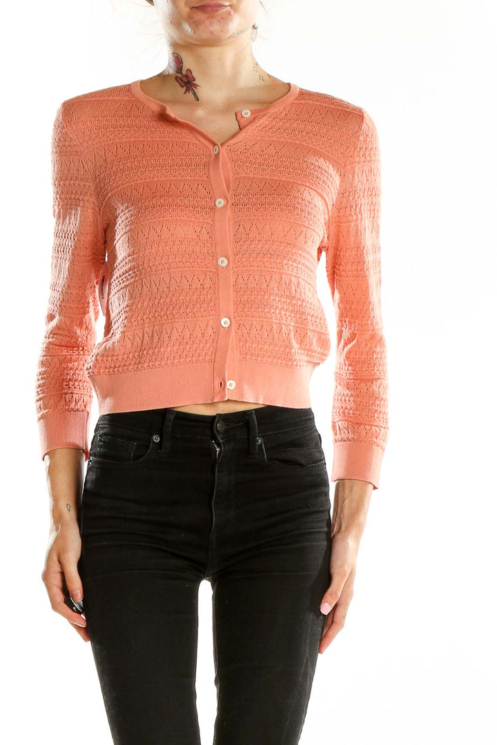 Elevate your wardrobe with this exquisite coral cotton knit cardigan from Brooks Brothers. This beautifully crafted piece showcases a delicate, textured knit pattern that adds depth and interest to its soft, feminine silhouette. The cardigan features a classic button-front design with a round neckline, perfect for layering over your favorite tops or dresses.