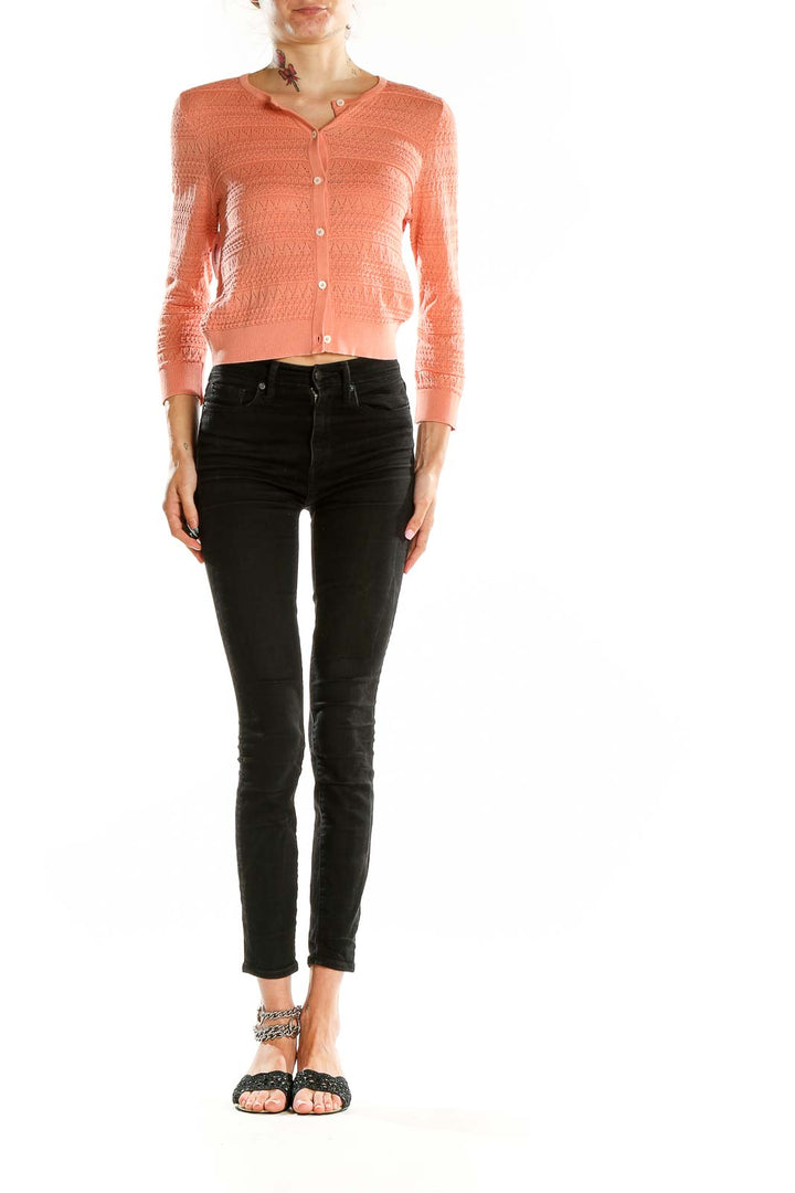 Front view of Brooks Brothers coral cotton knit cardigan with button closure