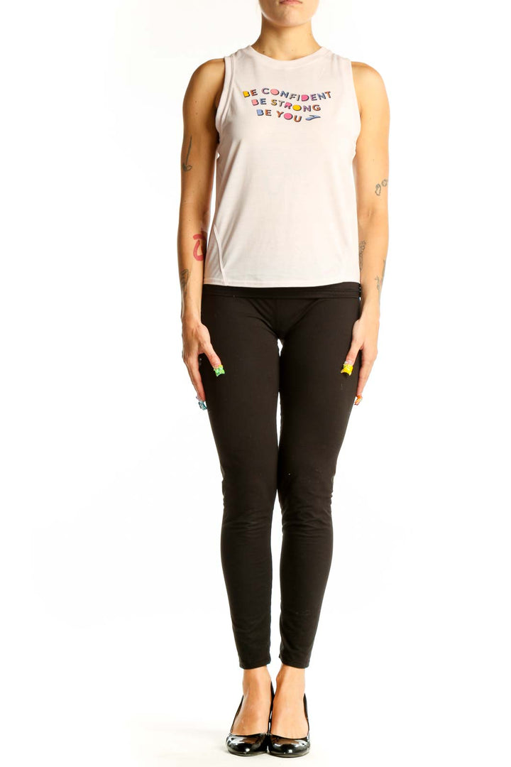 Elevate your workout wardrobe with this inspiring Brooks sleeveless tank top in pristine white. The front features a colorful, motivational message that reads 'Be Confident, Be Strong, Be You' in playful, multicolored lettering. Crafted from a blend of eco-friendly Lyocell and recycled polyester, this top offers both comfort and sustainability. The sleeveless design and relaxed fit allow for unrestricted movement during your fitness routines or casual outings. In excellent condition, this size Small tank measures 32" in the bust, 30" in the waist, and 21" in length, ensuring a flattering fit for a variety of body types. Whether you're hitting the gym or running errands, this Brooks tank top will keep you feeling confident and looking stylish.
