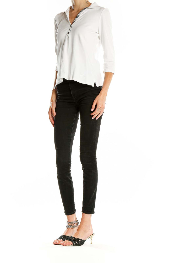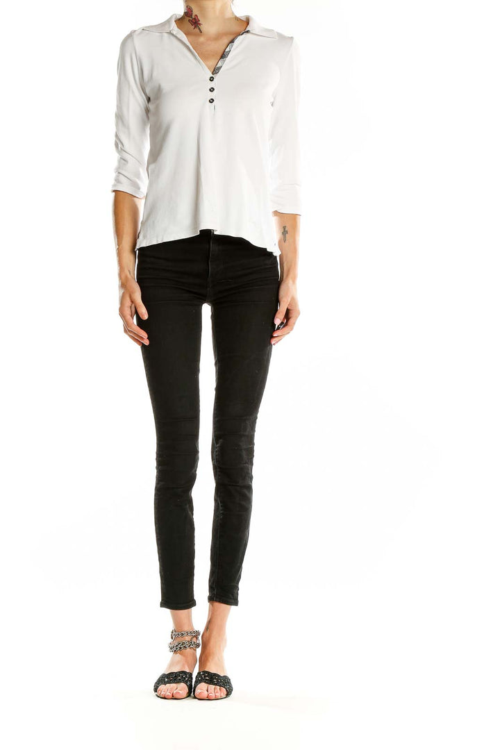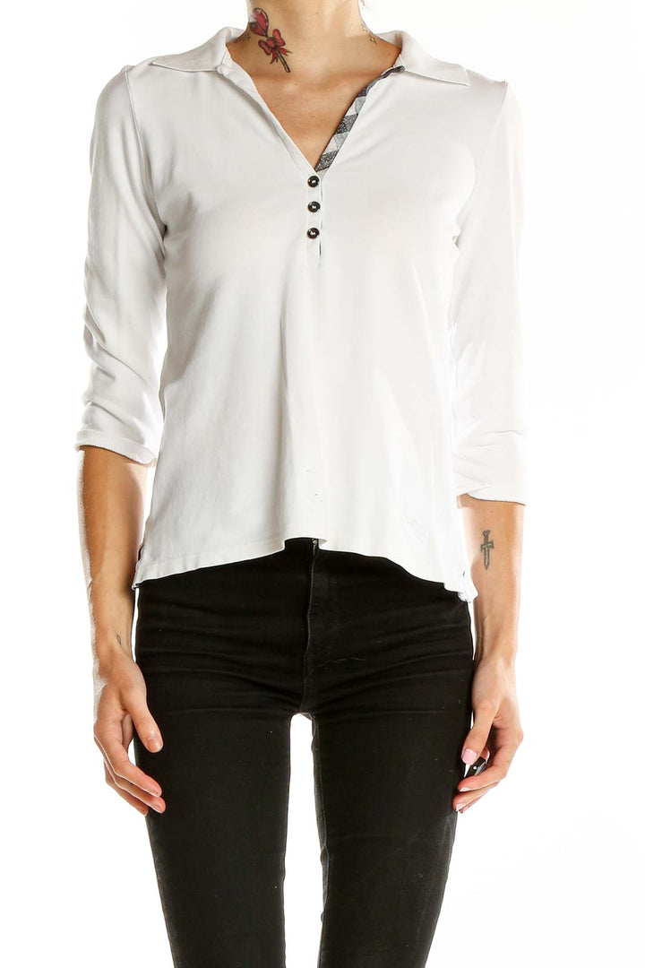 With its comfortable fit and timeless design, this Burberry polo is perfect for both casual outings and smart-casual events. The measurements (Bust 32", Hips 34", Length 19", Waist 26") ensure a flattering fit for a medium frame. Whether paired with jeans for a laid-back look or dressed up with chinos for a more polished appearance, this white polo shirt is a versatile piece that embodies effortless style.