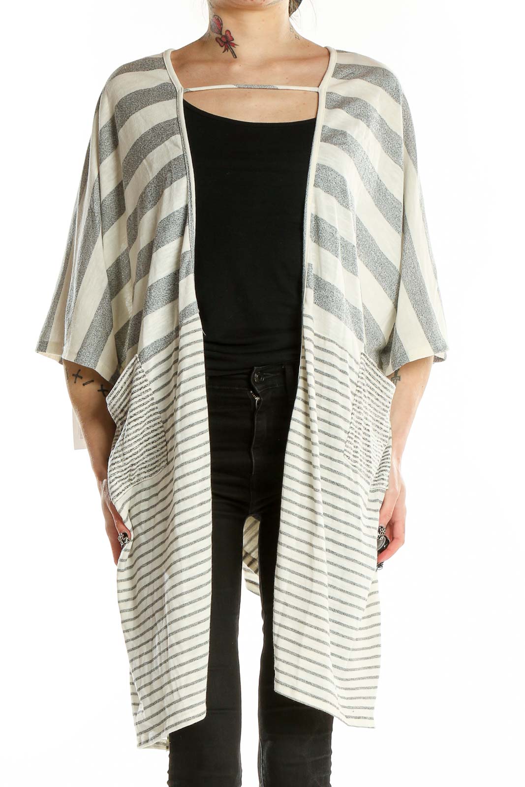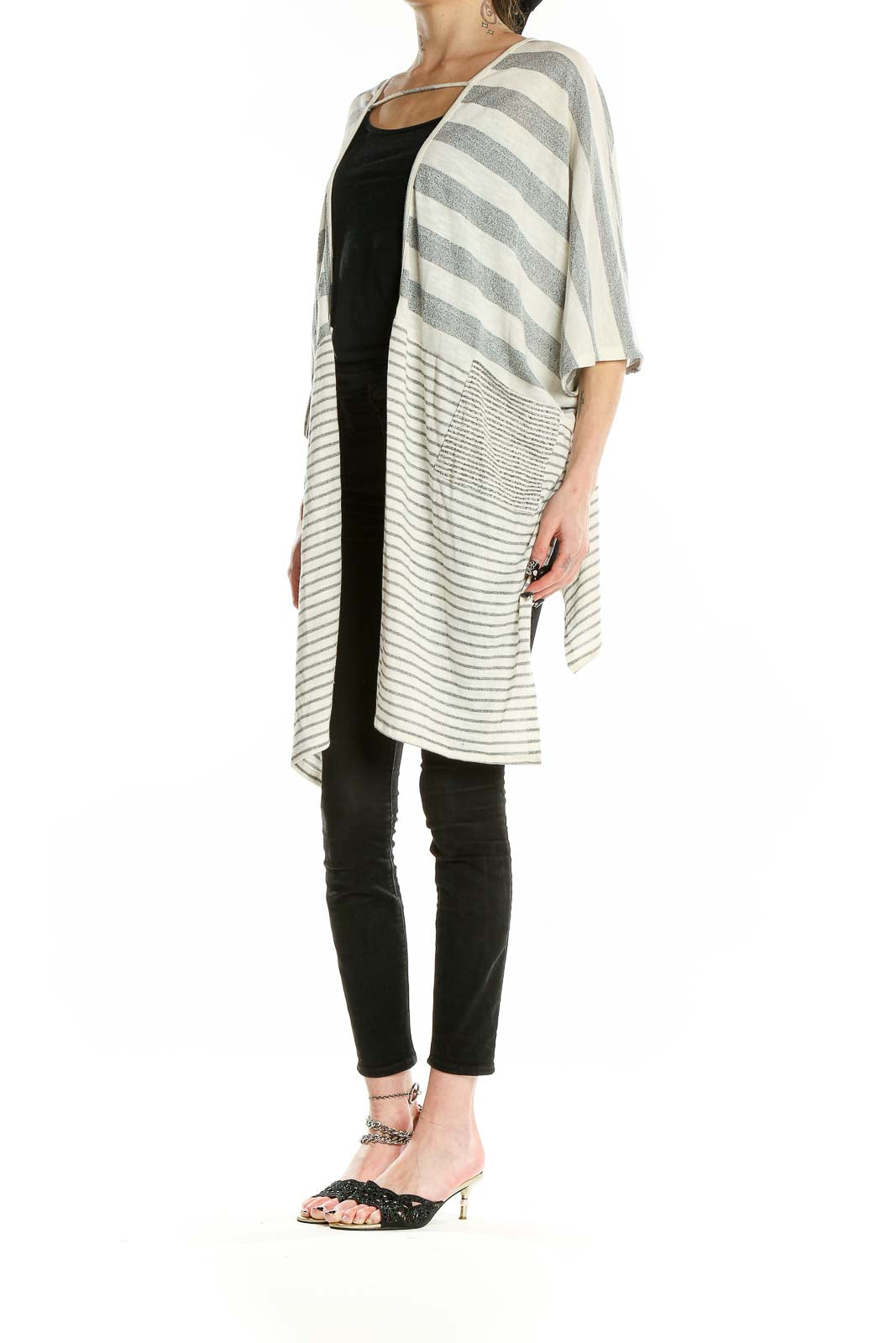 The cardigan showcases a striking pattern of bold gray stripes on a white background, transitioning to thinner stripes towards the bottom for a unique visual interest. Its open-front design allows for effortless layering over your favorite tops and dresses. The longer length provides excellent coverage, making it perfect for various occasions from casual outings to office wear.