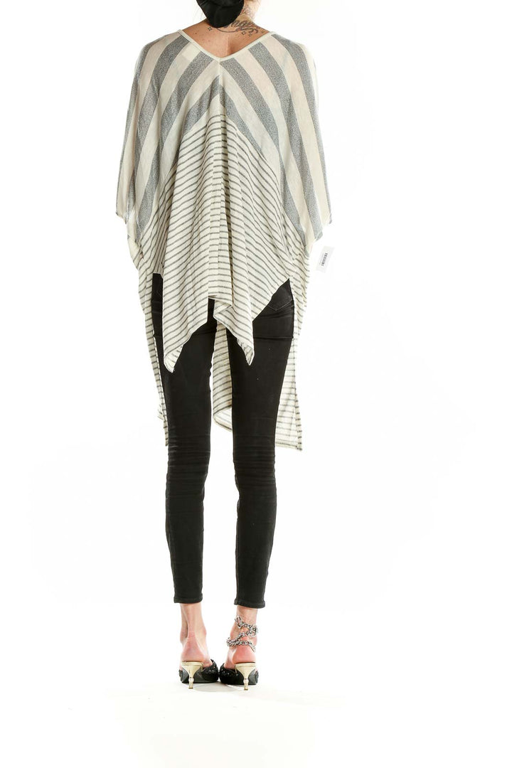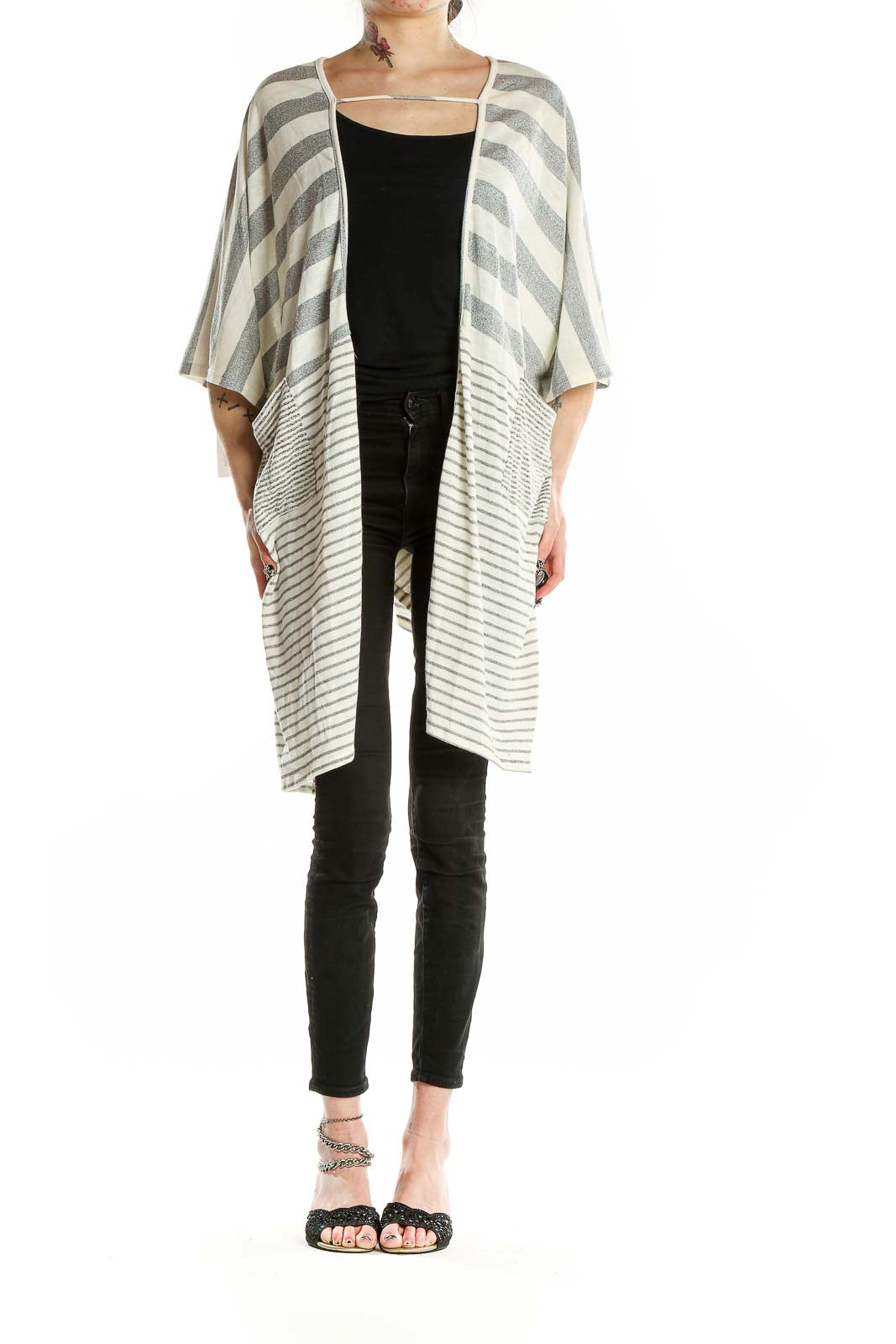 Elevate your casual wardrobe with this chic gray and white striped kimono cardigan by By Together. This versatile piece features a flowing silhouette with wide, kimono-style sleeves that create a dramatic and flattering effect. The soft blend of cotton, polyester, and rayon ensures comfort and easy care.